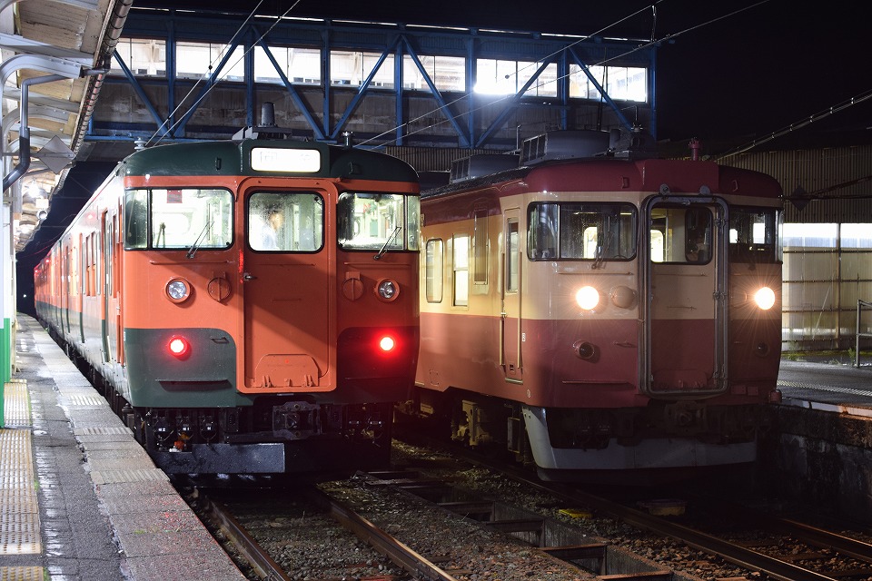 | 455・413系の夜行が直江津を出発し、まず妙高高原に着いた。 この日はちょうどしなの鉄道の115系が湘南色だったので、この並びが撮影できた。 |