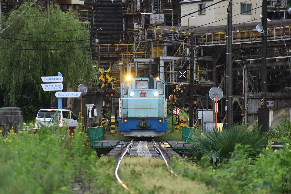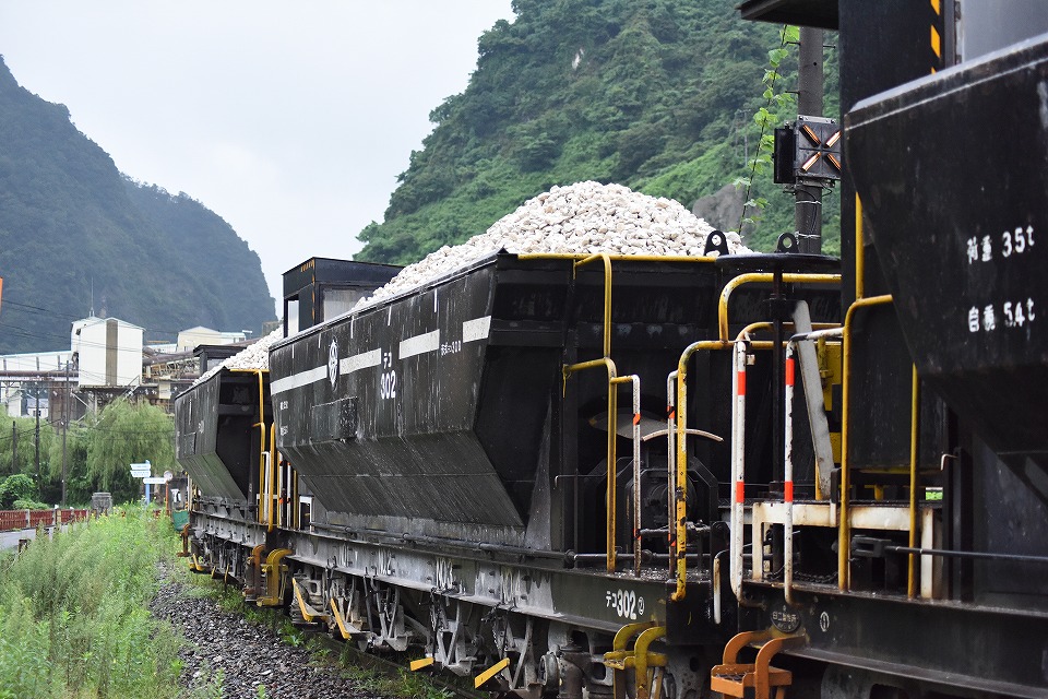 | 独特の貨車で石灰石を積み出し、工場へ運ぶ。 |