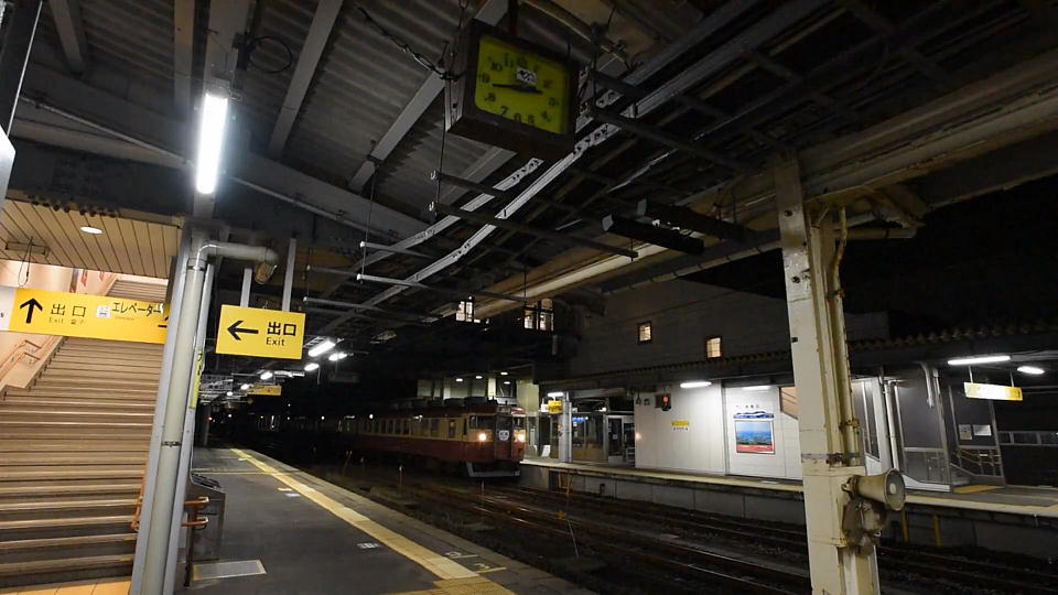 | 455・413系の「夜行」感が出せる撮影地を探した結果、糸魚川でホームの時計を入れることにした。 撮影時刻は02:43。 暗い中での撮影なら、ただの「夜」だけど、時刻が分かるように撮影すれば「夜行」って分かるでしょ(笑)。 |