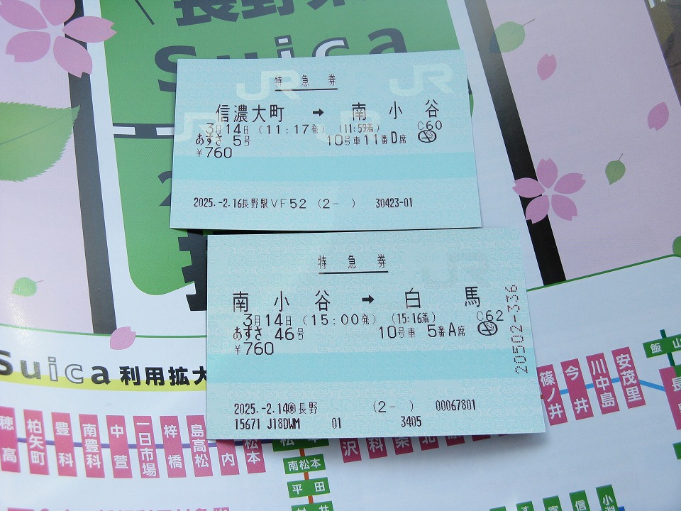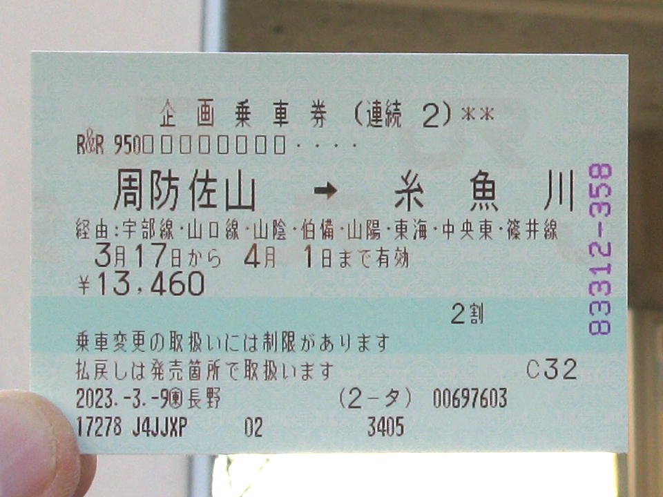| 2023(令和05)年3月は、春分の日辺りの休みを使って、先輩と 「DLやまぐち号」や381系国鉄色「やくも」を撮影後、「サンライズ出雲」で東京に出て、 すぐ新宿に移動して、南小谷行きの「あずさ5号」に乗った。 初めて「レール&レンタカーきっぷ」を使ってみた。連続きっぷにもした。 本来なら新山口着発の乗車券でいいのだが、手元に残したかったので、 同じ運賃区分で「地域感」がある旧国名入りの駅を着発地にした。 |