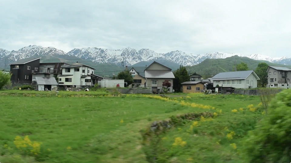 | そして、本番の「あずさ5号」。 嬉しいことに、先ほどの鈍行の時に白馬三山(※)の上にあった雲は、僅か20分の間に消えてくれた。 アングルを少し変えて、列車の右側に昔は茅葺きであっただろう民家を置いた。 こうすれば、このようにキャプチャーしてもいい感じだ。 惜しむらくは、民家のトタン屋根が赤系だったらもっとよく映えたんだけどな~(勝手なこといってますね。)。 約30秒の動画はこちら。