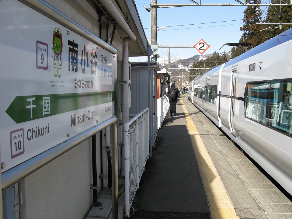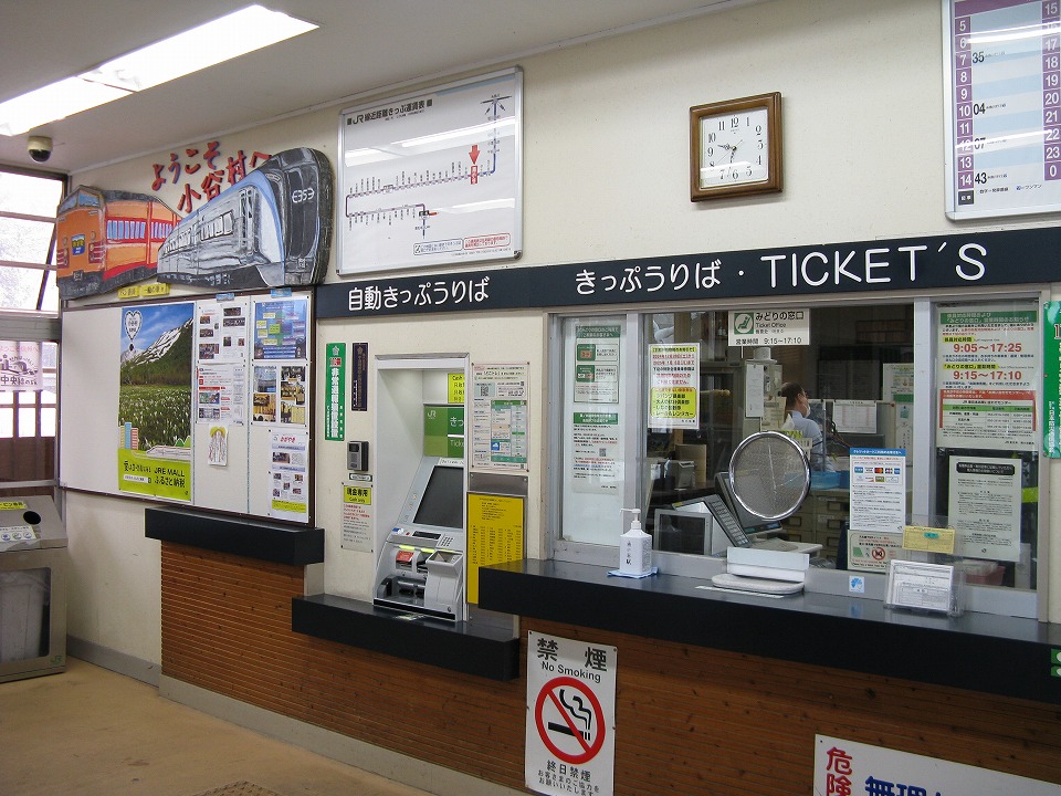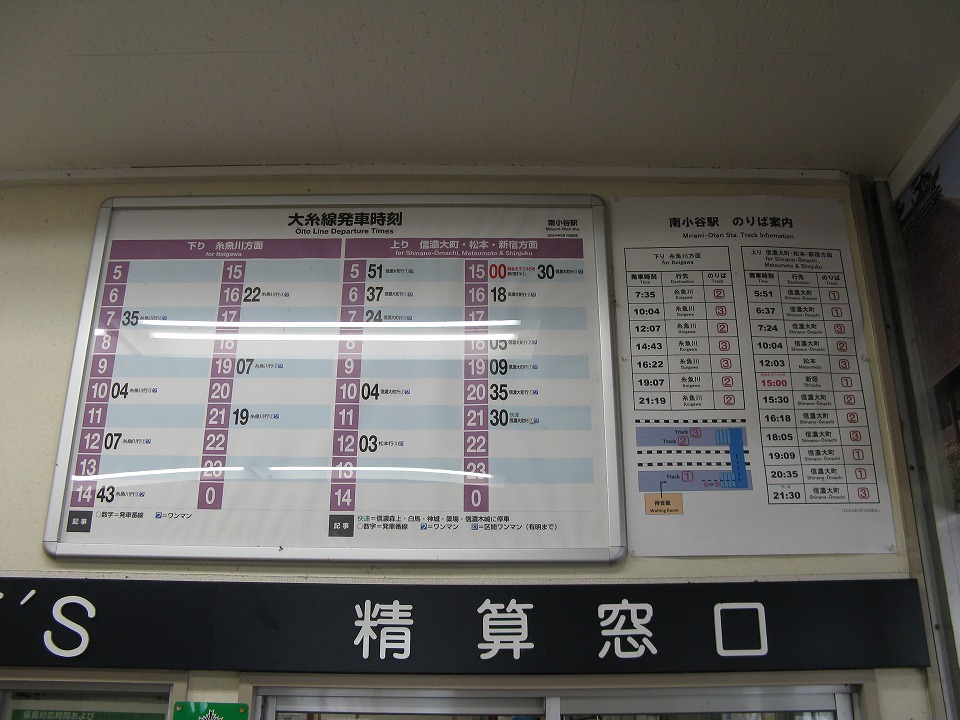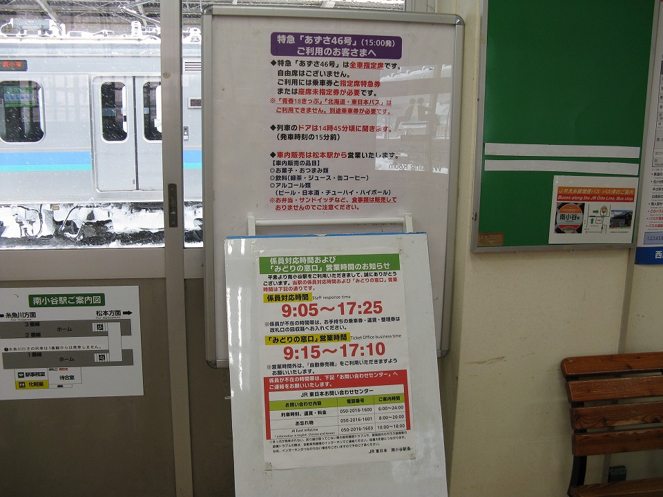 | 南小谷駅のきっぷうりば。 これまでは乗り継ぎでしか利用していなかったので、駅として訪れるのは初めてだ。 小谷村の小さな駅だが、JR東日本直営で、しかも嬉しいことにみどりの窓口も設置されている。 ここより利用客が多い信濃大町や白馬ですら「指定券発売機」化されているのにありがたいことだが、 今後「あずさ」の乗り入れがなくなるとどうなるものか…。 |