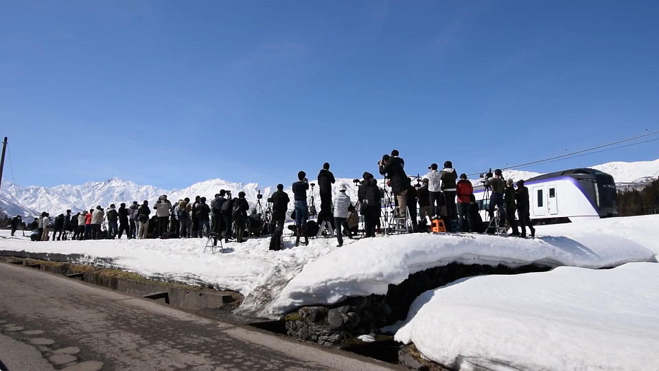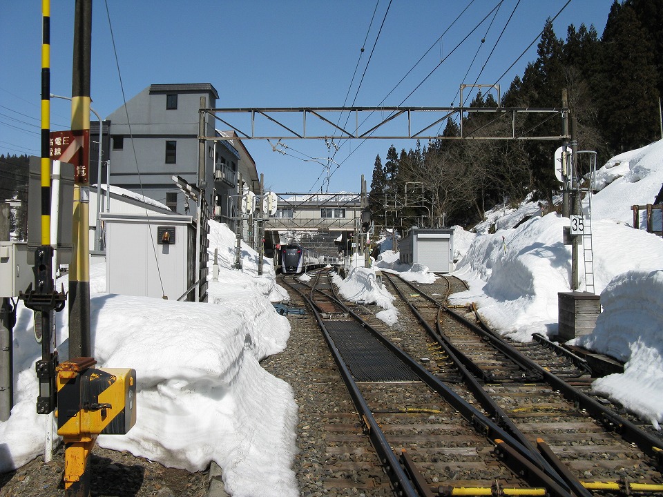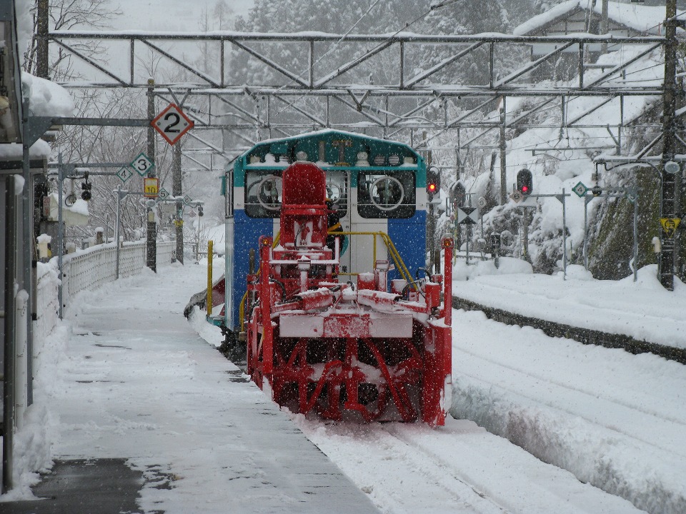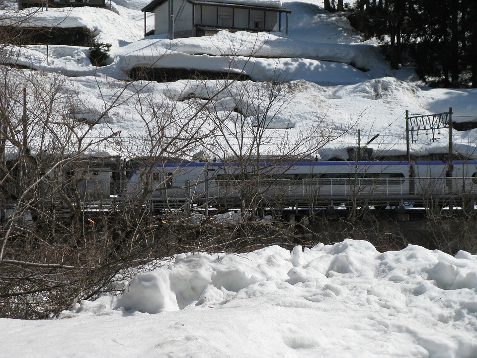 | 「あずさ5号」の折り返しの「あずさ46号」は、白馬より北での撮影が分かる場所で、 雪の多さなどの季節感を入れて撮影しようと考え、白馬大池駅に来た。 ここでは、除雪車が動いていたのでこれと白馬大池を通過する「あずさ46号」を撮影した 約49秒の動画はこちら。 こんなアングルは、一般的な「トレインファースト」の撮りテツなら絶対にやんないよね(笑)。 |