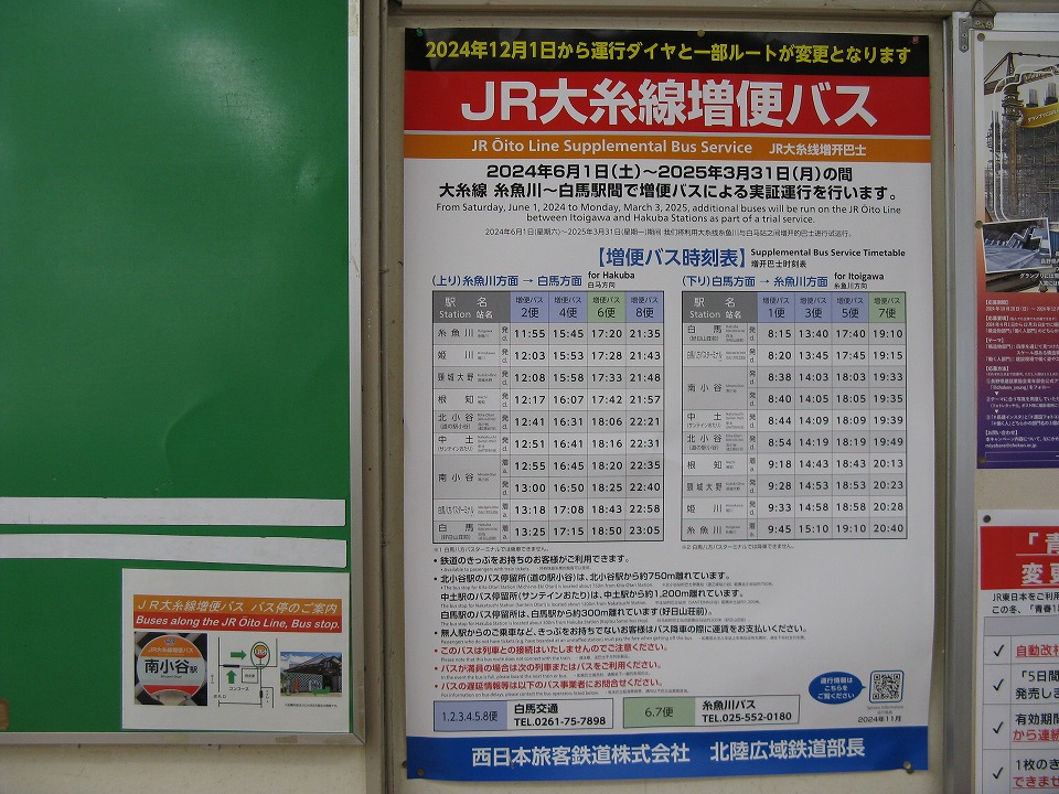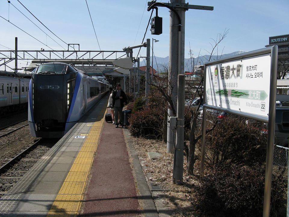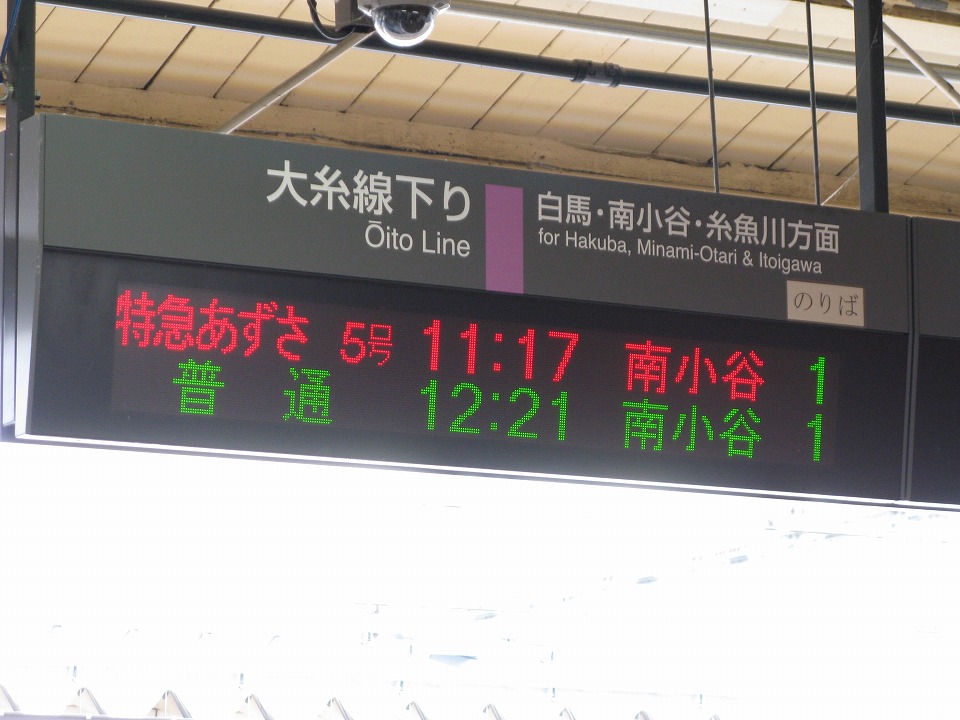 | 南小谷へ行くには、白馬で鈍行の5329M南小谷行きに乗り換えられるようになった。 2025/03のダイヤ改正までは、「あずさ5号」に先行していたが、改正後は白馬で30分も停車して連絡し、 「あずさ5号」の短縮区間分を補うカタチになった。 |