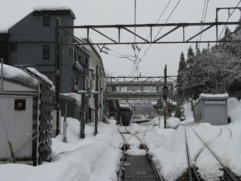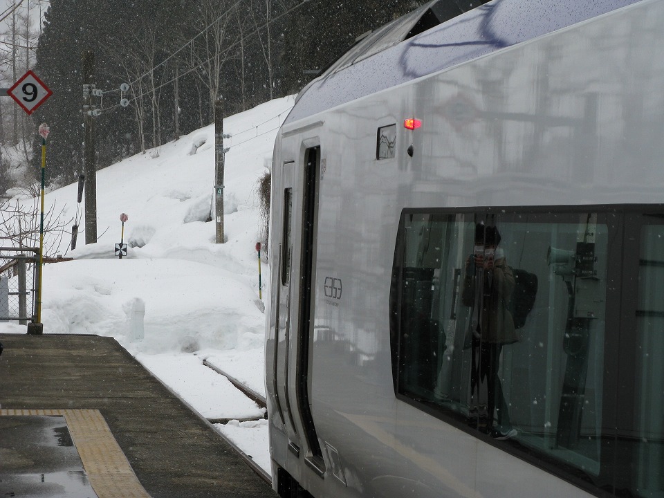 | 「あずさ5号」は信濃森上で運転停車するが、ホームの普通列車が停まらない部分の除雪はしておらず、 車体スレスレ(ホントにスレスレ!)まで雪が迫る。 |