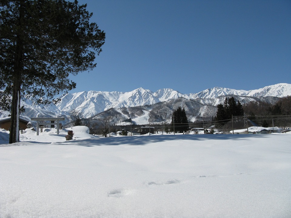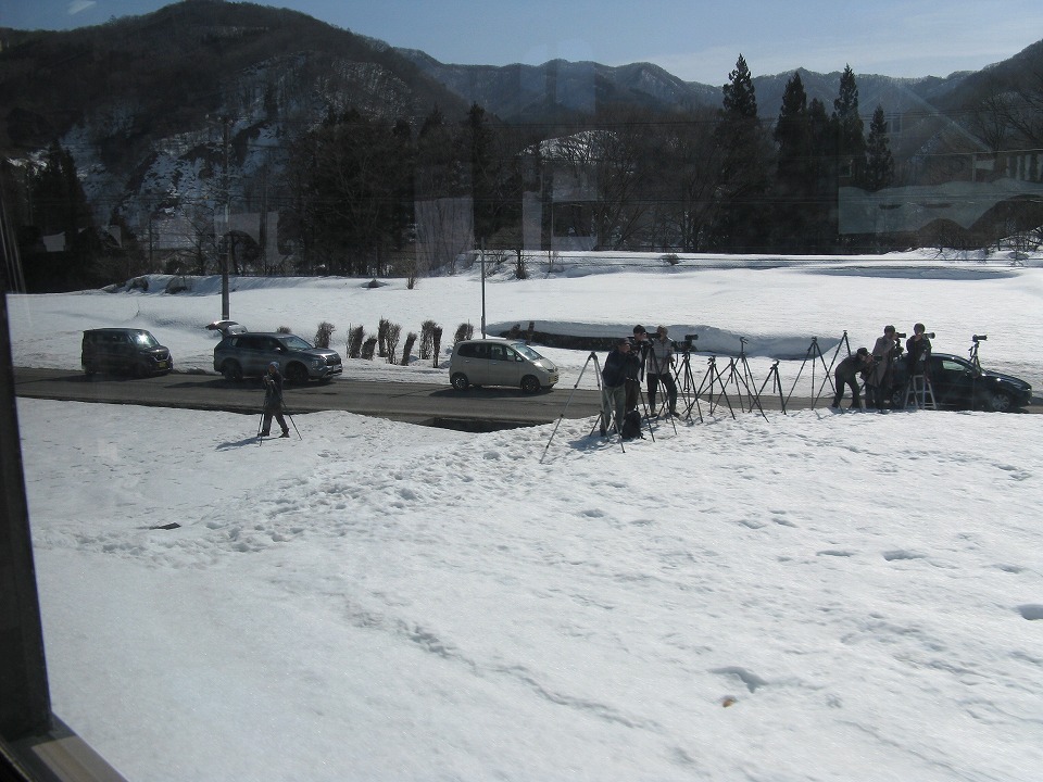 ここは有名な撮影ポイントだが、撮りテツのほとんどは定番のアングルのようだった。 つまり、まずトレインファーストで、せいぜいバックに八方尾根スキー場やそれより奥の雪山という構図だ。 でも、白馬~南小谷での撮影であれば、白馬三山に敬意を表しほしいな~、 と俺は思うのだョ(笑)。 |