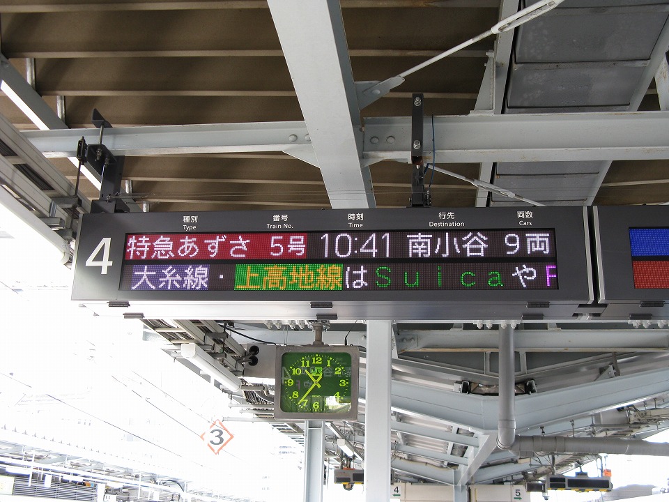 | 松本発車時の約04分04秒の動画はこちら。 カレチさんによる「交通系ICカードの利用不可駅」などの案内も入ってるよ。 |