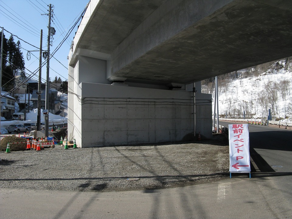 | 工事中の高架下はイベント用の駐車場になっている。 恐らく「南小谷あずさ」の関係だと思うけど、何かしらのイベントをやるんだね。 |