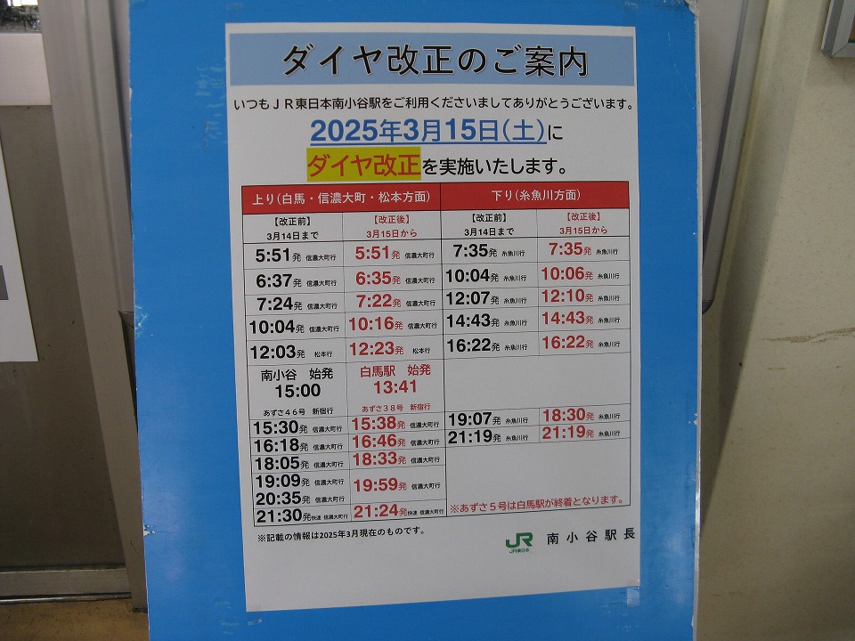 | 明日からのダイヤ改正の案内。 当然だが、南小谷始発のあずさが白馬始発になっている。 |