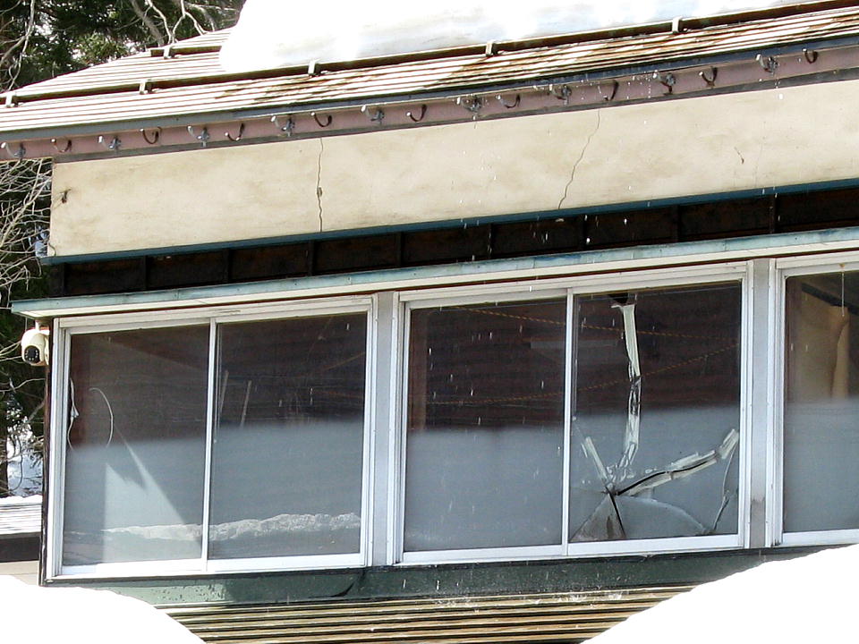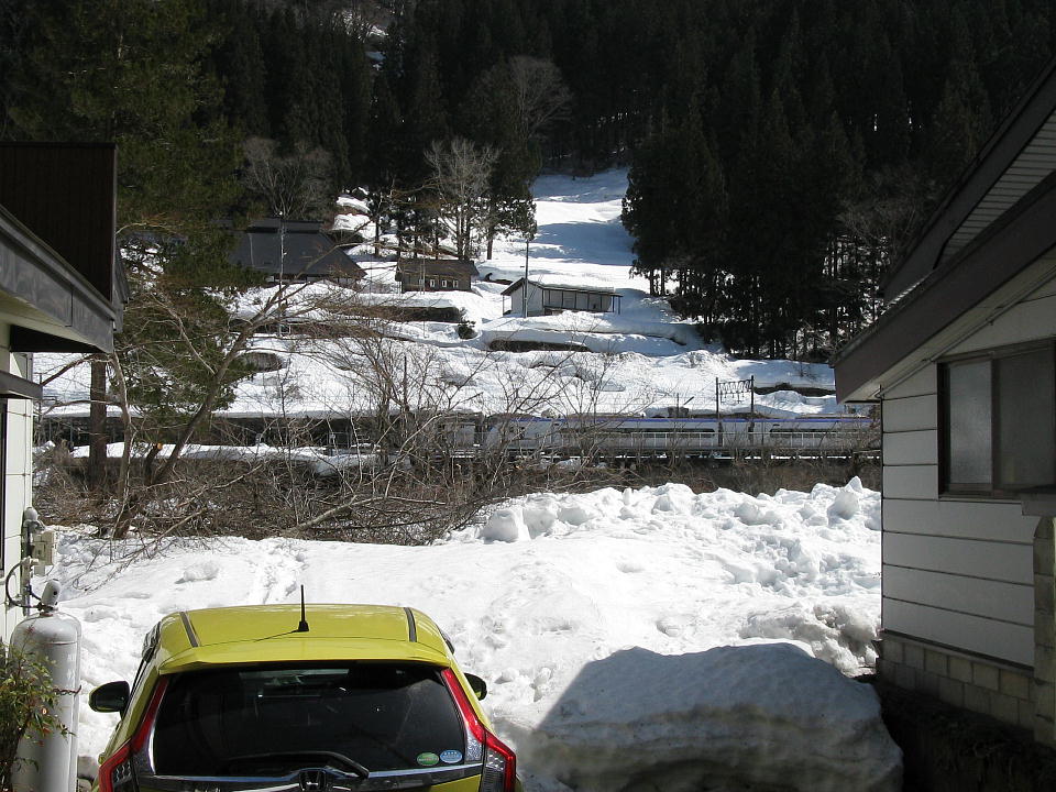 | 国道147号沿いの民家。 写真ではあまりよく分からないが、屋根の雪が溶けて、軒先に雨のように"降って"いる。 写真では「小雨」みたいに写っているが、実際はもっとバシャバシャだ。 春が近いね。雪が溶けると春になる。 |