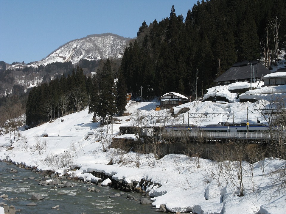 | では、糸魚川へ行くゾ… と、器材をゆっくり片して、撮影後の撮りテツのクルマの渋滞にちょっと巻き込まつつ国道147号に出て、小谷・糸魚川方面に北上したら、 あれ? 姫川の対岸の大糸線を「あずさ5号」が走ってるじゃん! 向こうは南小谷の手前で25km/hまで落とすから、 こっちがクルマでフツーに走っていても追いつくんだ! ということで、南小谷駅直前の踏切で辛うじて撮影ができた。 ホントにコンデジでただ撮っただけ(笑)。 この撮影後、新潟へ向かったよ。 |