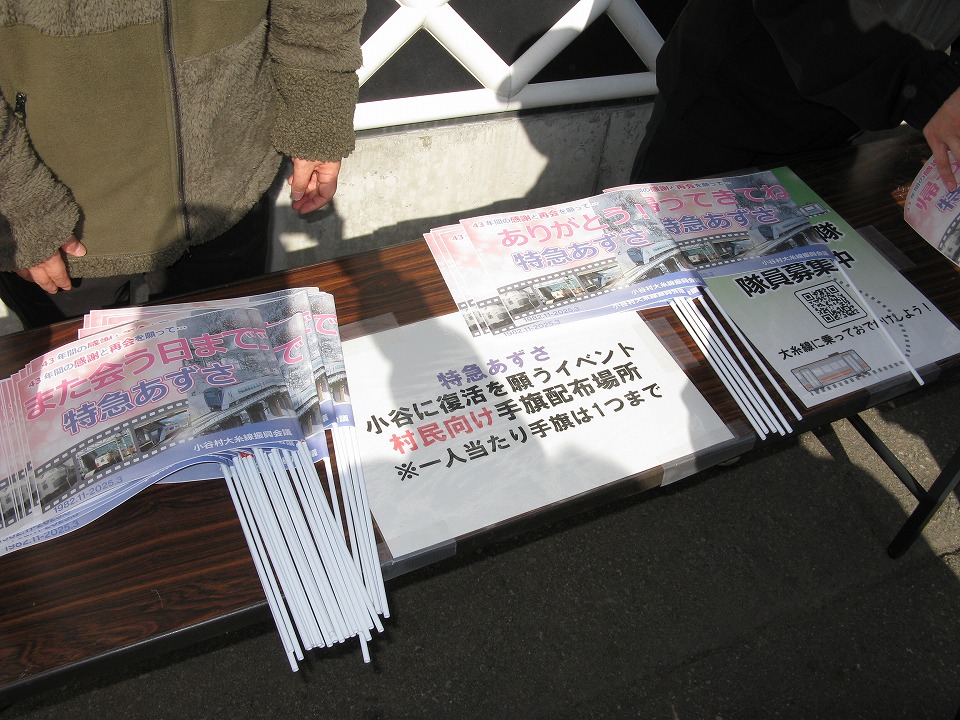 | あっ、手旗を配ってる~っと思ったら、「村民向け」だって。残念。 きっとたくさんは作れなかったんだろうと思う。 手旗は「また会う日まで」「ありがとう」「帰ってきてね」の3種類があるようだった。 これが「イベント」だったんだな。 撮影許可済み。 |
