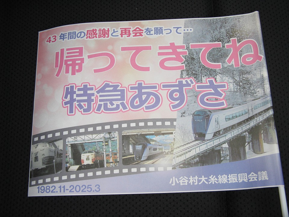 | 「あずさ46号」の「見送り隊」は当然とっくに撤収していたので、クルマをちょっと走らせたところで、 ダメ元で手旗が余っていたらもらえないか相談したら、いただけた(嬉)。 3種類ともあったが、全部は厚かましかったので、「帰ってきてね」の美品を選んだ。 これで「南小谷あずさ」の取材は終了。 明日からは「白馬あずさ」だね。またいつか乗ってみたいし、大糸線内での撮影もしておきたい。 このページの冒頭でも書いたが、大糸線乗り入れ自体いつまで続くか分かんないもんね。 |
