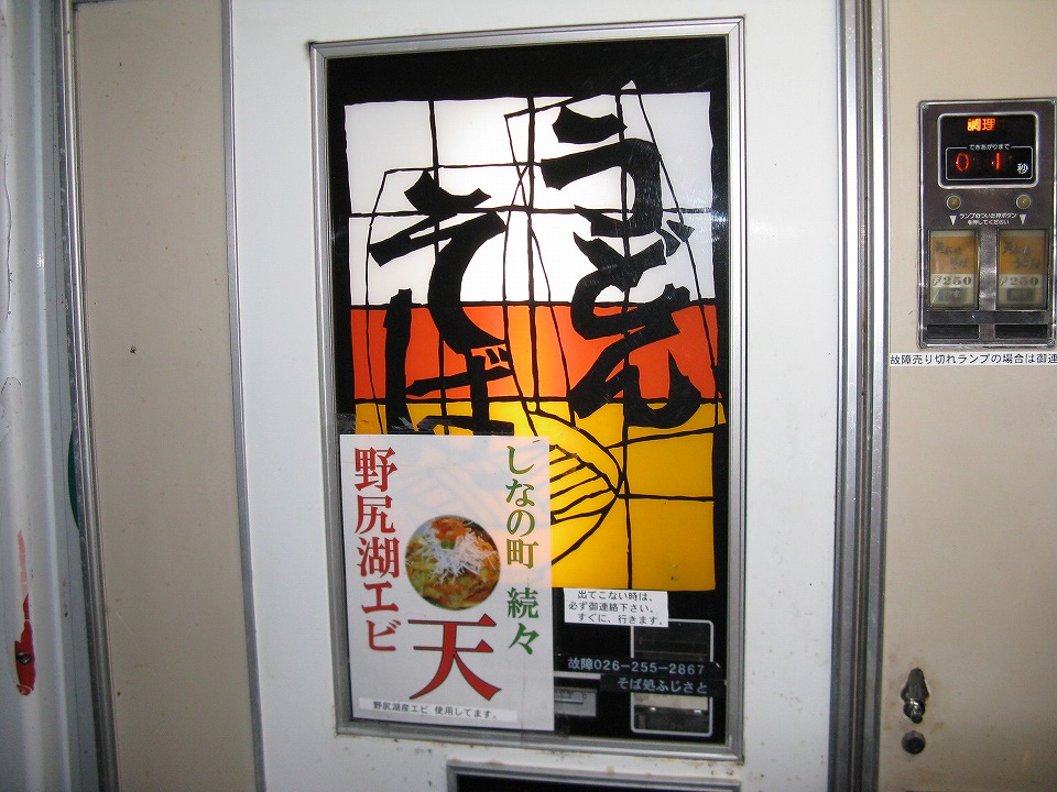| 【参考】 2012(平成20)年の、同じ「う・そ自販機」。 この頃は、すぐ近くの野尻湖で獲れたエビを使ったエビ天を乗せていた。 その写真は、残念ながら、なし。なんで撮ってなかったんだろう…。 |