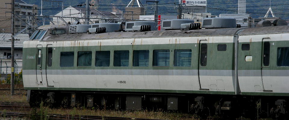 | 【参考】 189系の「あさま」で使用されていたクハ189-510。 2023/10現在、JR東日本長野総合車両センターに留置・保存されている。 「ASAMA」のロゴも残っている。 ね、「緑やくも色」と「パッと見」は似てるでしょ。 |