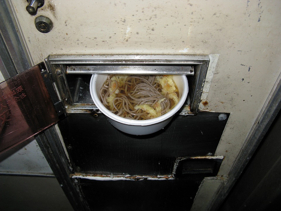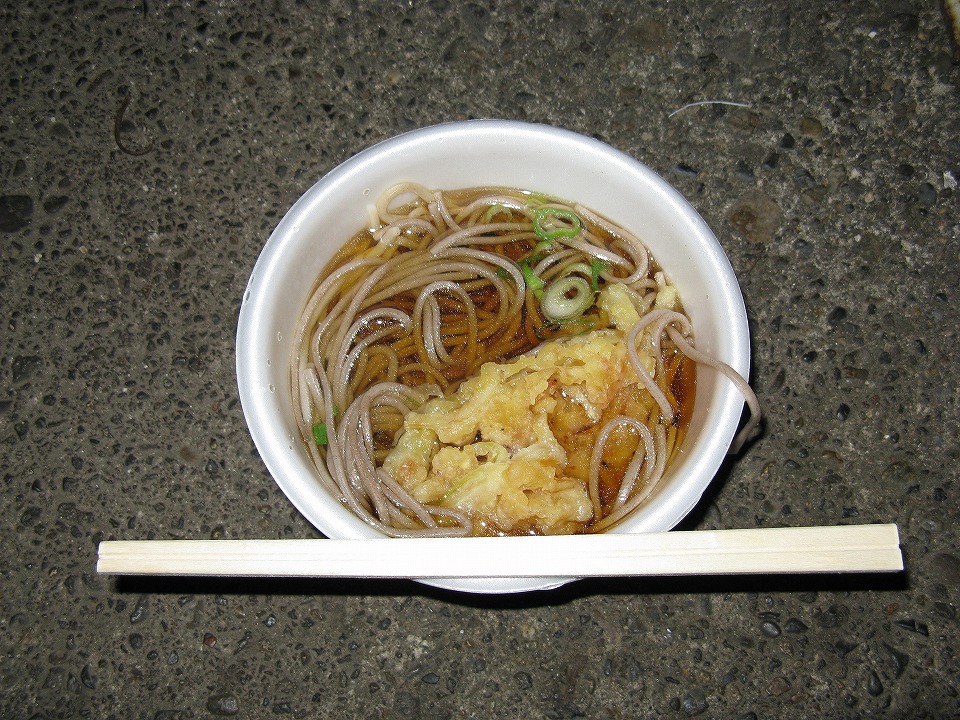 | 天ぷらそば250円ナリ。 麺のステキな飛び出しは、自販機から出てきたそのまま。 |