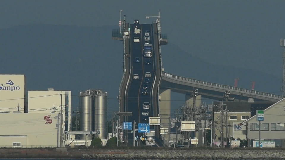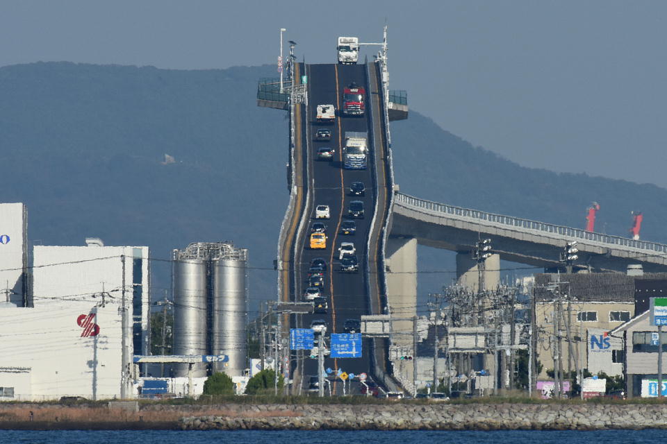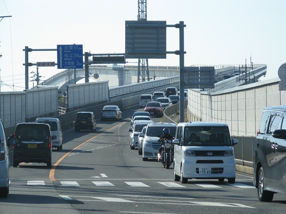| 一方で俺は前から来てみたかった「ベタ踏み坂」の登頂に挑む(笑)。 米子市内から境港市に出て、ベタ踏み坂としてダイハツのCMで有名になった 「江島大橋」(えしまおおはし:約1446m)を、まず鳥取県側から通ってみる。 |