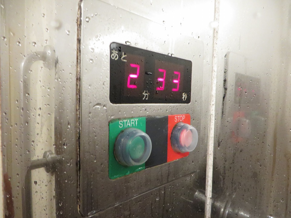 | 「サンライズ出雲」での最大の目的である、シャワー。 シャワーを使うためには、自販機で発売しているシャワーカード(330円)が必要なのだが、 発売枚数が僅か20枚ほどなので、繁忙期を中心に、始発駅の時点で売り切れることがほとんど。 6分間(途中ストップ可)使用できるが、今回は2分33秒余った。 なお、時間をたくさん余らせても、シャワールームのドアロックを解除した時点でクリアされてしまうので、 次の人が使えるということはない。 |