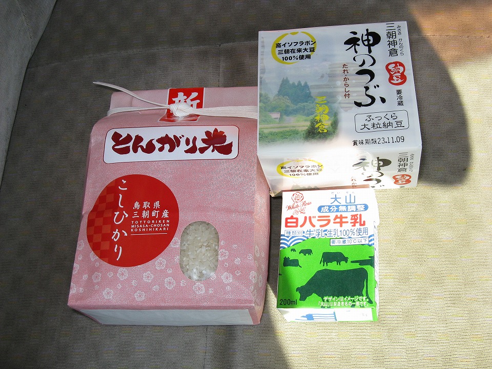| とりあえず、三朝町産のこしひかり「とんがり米」ってのがあったので、それをGET。 その他、三朝町在来大豆使用の大粒納豆や、鳥取といえばの白バラ牛乳も。 |