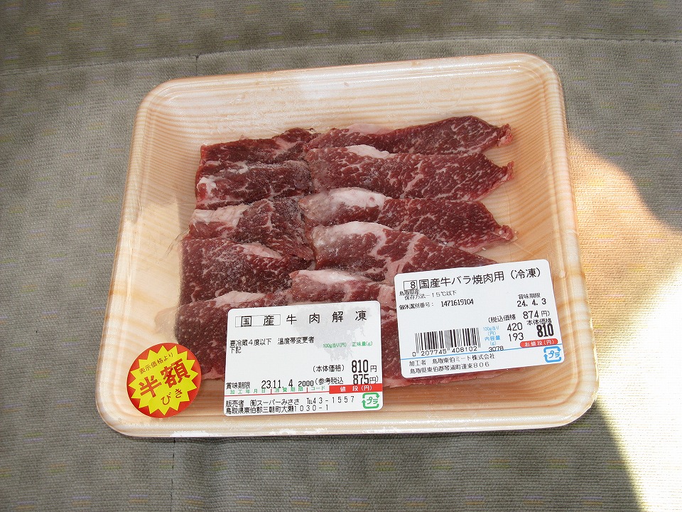 | ついでに、半額になっていた牛肉も晩メシ用に買っちゃいました。 |