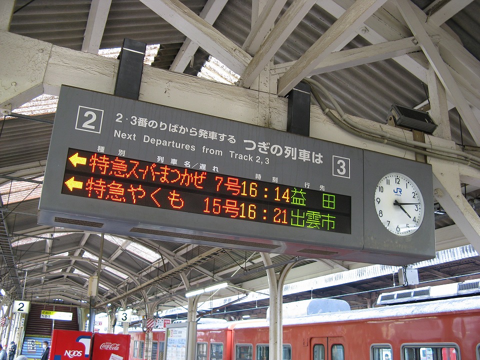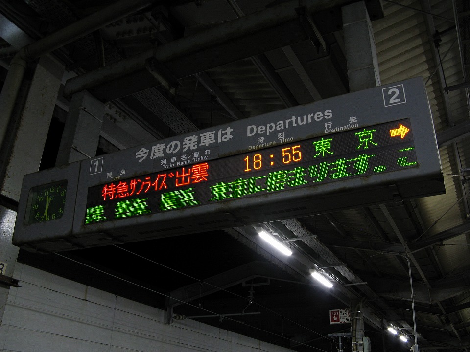 | 夕方に差しかかり、今日もまた「サンライズ出雲」のシャワーを浴びたいので、 米子から出雲市に移動しておく。 昨日とおんなじ並びの発車案内だが、今日は上段の「スーパーまつかぜ7号」に乗ってみる。 |