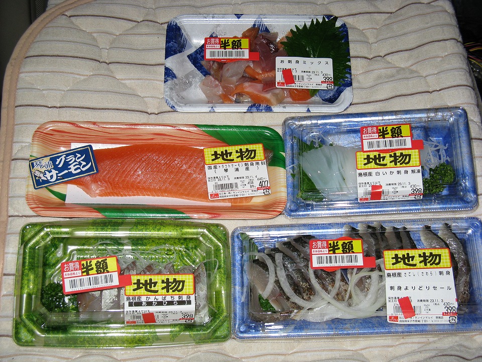 | ここで最後の晩餐(いつものフレーズですね。)。 さっき米子でいろいろと買い込んだのは、左下から時計回りに、 ・いかリング唐揚げ ・あかみず(あこう) ・天然はまち刺身 ・のどぐろ刺身 ・米吾のしめさば押し ・和牛モモ焼肉用 ・養殖真さば刺身 ・だるま刺身 ・赤えび 表示はレシートに習ったので、米吾のは「寿司」がちょん切れている。 これらと焼酎を買って、しめて5,000円弱(値引き後)。 これだけの量を居酒屋で呑み喰いしたら確実に1万円を超えるね。 楽しいけど、旅が終わる寂しさもある夜は更けてゆくのです。 |