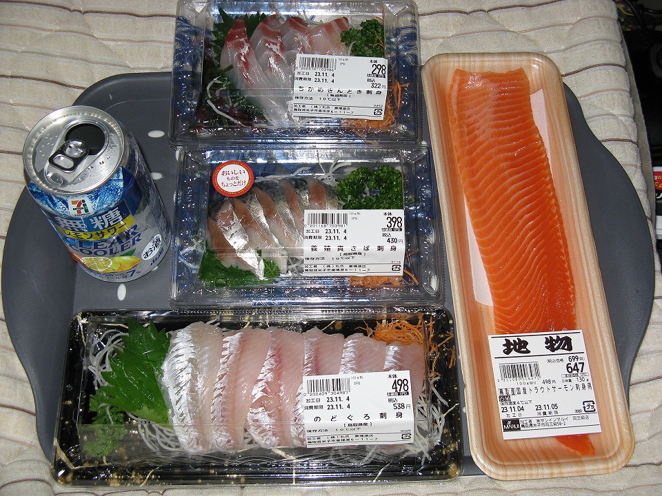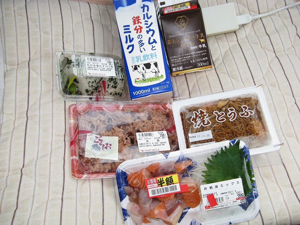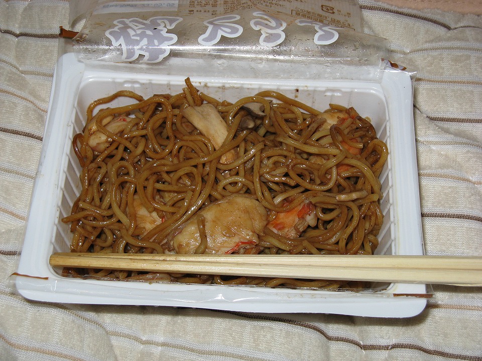 | 昨日刺身を買い込んだ「スーパーマルイ車尾店」は24h営業なので、朝メシを買うにも便利だ。 コメが食いたくなったので、ワカメおむすびや赤飯にした。 刺身は昨日手を付けなかったもの。 俺名物の「豆腐容器焼きそば」は、これでラスト。 |