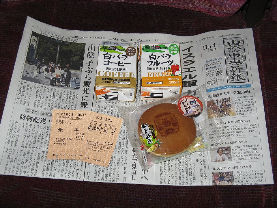 | 出雲市からは特急「やくも14号」ですぐ戻る。 この乗車にはリキが入っておらず、きっぷも自販機(笑)。 地元紙とおやつを買い込んで車内で過ごした。 |