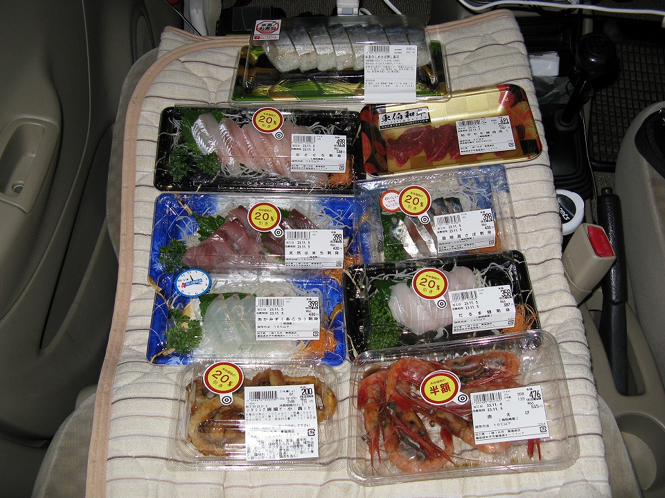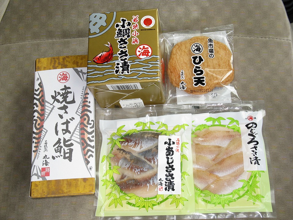 | 名物の「小鯛ささ漬」を始めいくつか買い込んだ。 前回は車載の冷蔵庫の空き容量が厳しくて「小鯛ささ漬」は小樽しか買えなかったのだが、 今回は予め容量を確保しておいたので、大樽をGETした(嬉)。 ひら天は運転しながら食す。 |