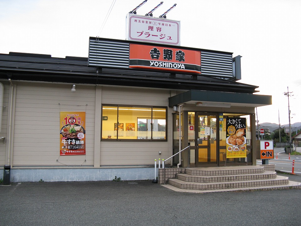 | 新温泉(浜坂)から山陰近畿道と国道178号、国道312号をのんびり走って豊岡市内に入った。 「吉野家178号線豊岡店」で朝メシにしよう。 ど~でもい~けど、この写真ではまるで吉野家の看板の上にプラージュの看板が乗っかっているように写っているが、 たまたまこのように写ったもので、プラージュは吉野家の隣の別な建物です(笑)。 |