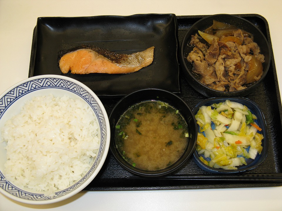| 牛鮭定食688円ナリ(ごはん大盛無料)にお新香140円ナリを付けて、 合計828円ナリ。大好きな「吉野家」で大満足なのだ。 |
