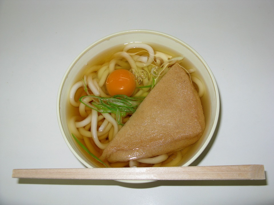 | 社名はともかく、きつねうどん300円ナリを食す。 月見の卵は、信州から持って来ていた2ケのうちの、残りの1ケ。 関西ダシで旨いのだ。 今日はこの先ロングランがあるので、他の献立は食さず1杯のみにとどめた。 |