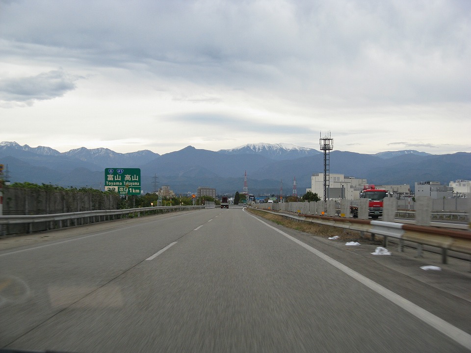 | 富山では雪山(名前分からず。野口五郎岳方向だとは思うんだけど。)を正面に見つつ、北陸道を快適に走る。 |
