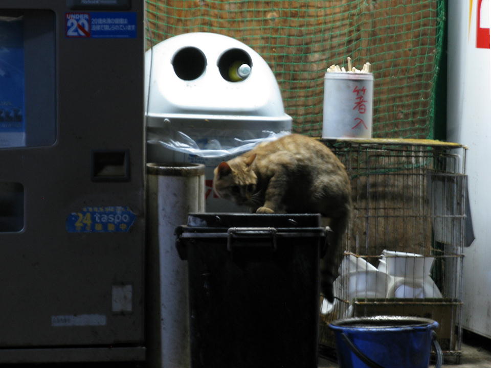 | どらねこは麺の残りを捨てる容器に登って漁っていた。 この容器は、フタの部分がザル状の網になっており、そこに捨てるとつゆは下に落ち、 麺や天ぷらは網に残るので、それを狙ってどらねこやカラスやスズメなどが来るのだ。 どらねこぐらいの大きさだったら、この容器に登ったらひっくり返りそうに思うが、この時は何事もなかった。 この写真は、手持ち1秒ながら、じっとしないどらねこを車内からなんとか写せた1枚。 |