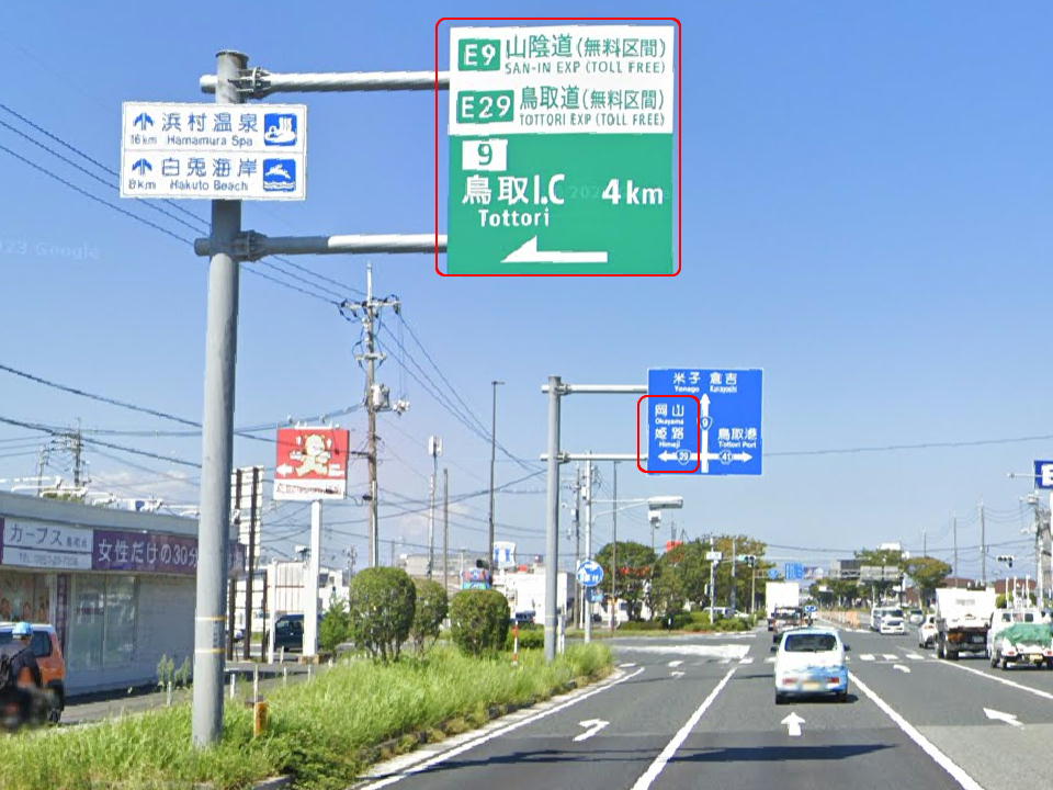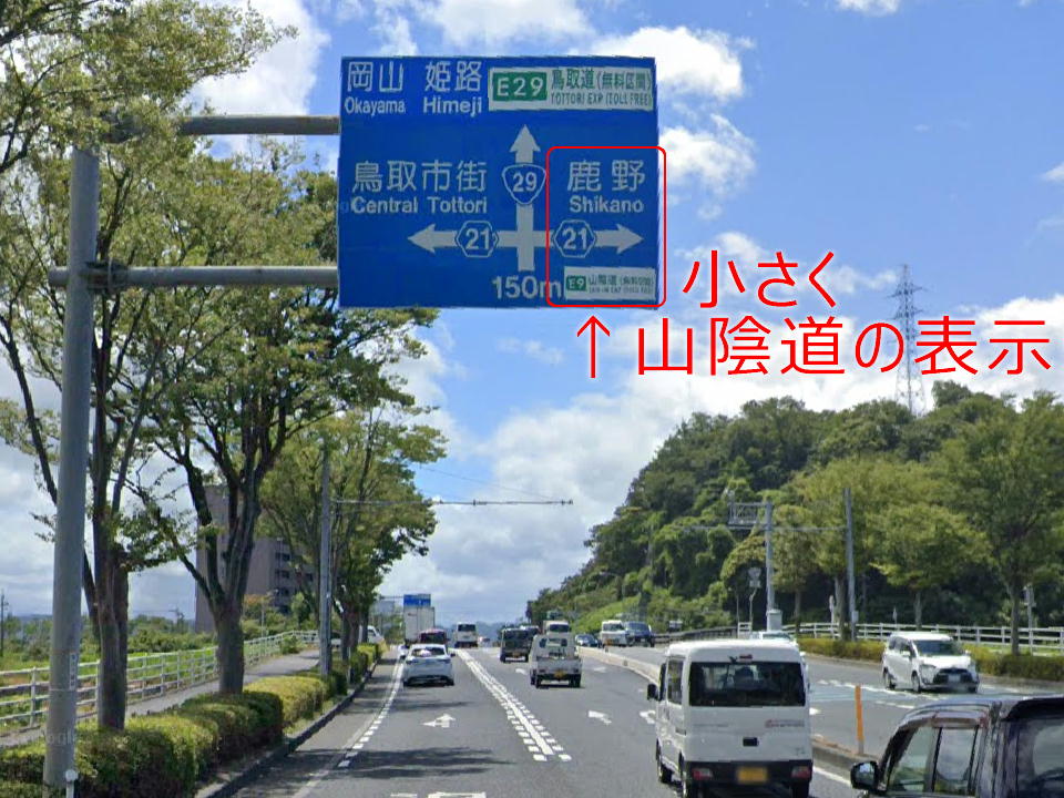 | でだ、ここが間違いやすい! 国道29号を岡山・姫路(つまり鳥取インター方面)に走るとほどなく、県道21号の交差点がある。 大山方面へはここを右折して山陰道方面に進む。進むと鳥取西インターがある。 「山陰道」の表示をもっと大きくせぇよ。 右折したら左車線にいよう。 ※間違って直進しても鳥取インターから高速に乗れるけど、1区間分ソンをすることになるよ。 |