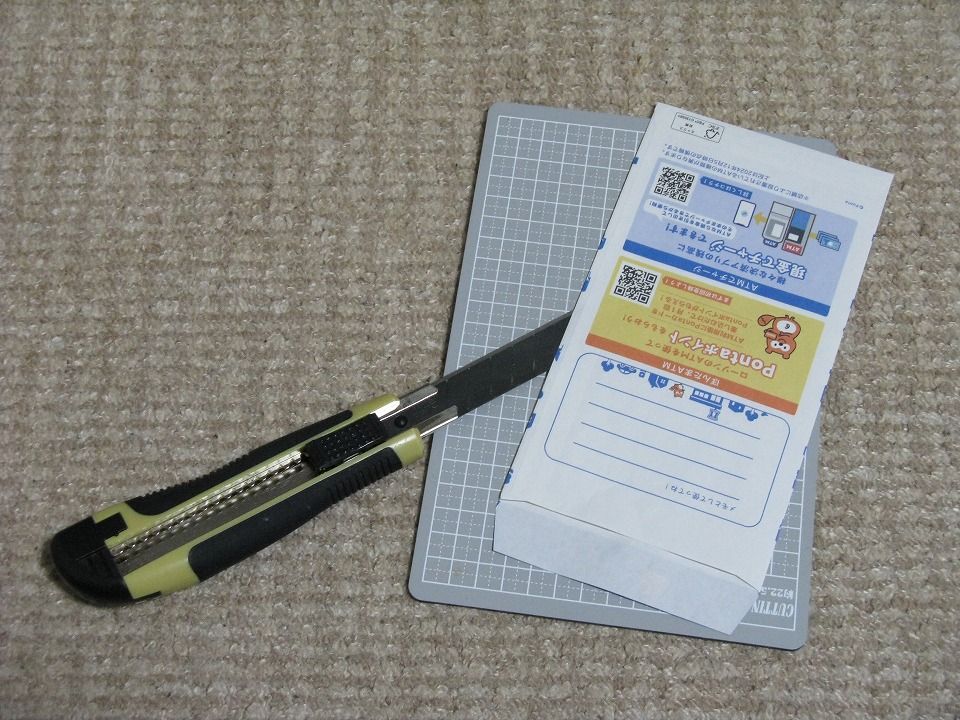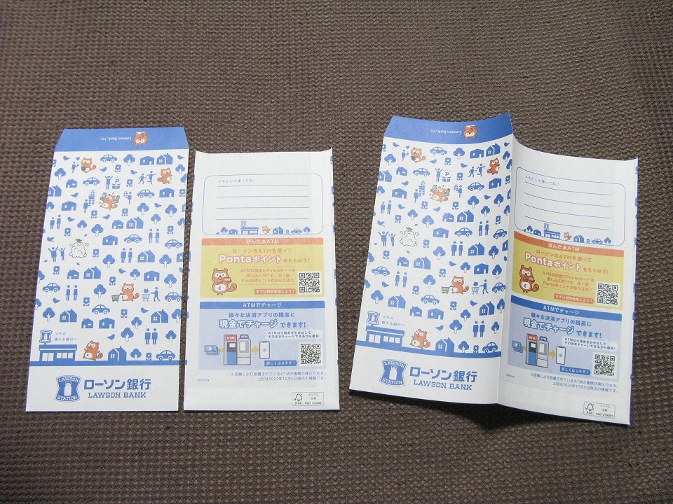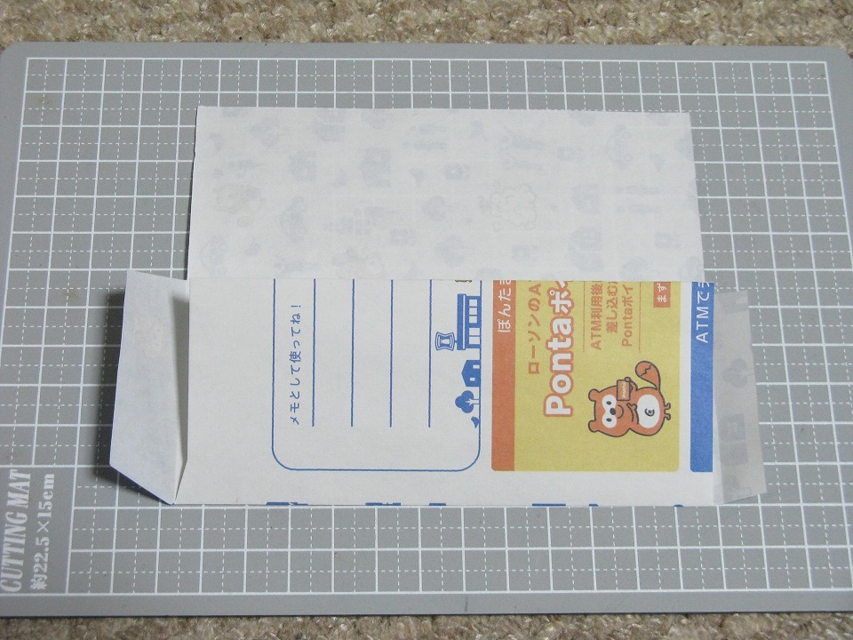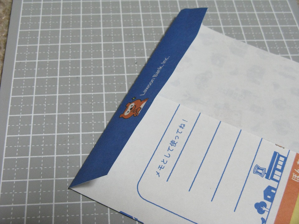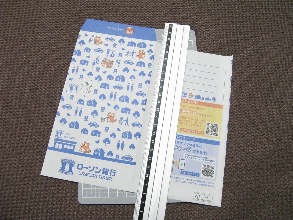 | 2025/03現在、ローソンのATMんとこに置いてある封筒。 おカネを出し入れするときにもらってくる。 ※以下、「○辺を切る」という表現の場合は封筒としてではなく、写真での上下左右の辺を指します。 |