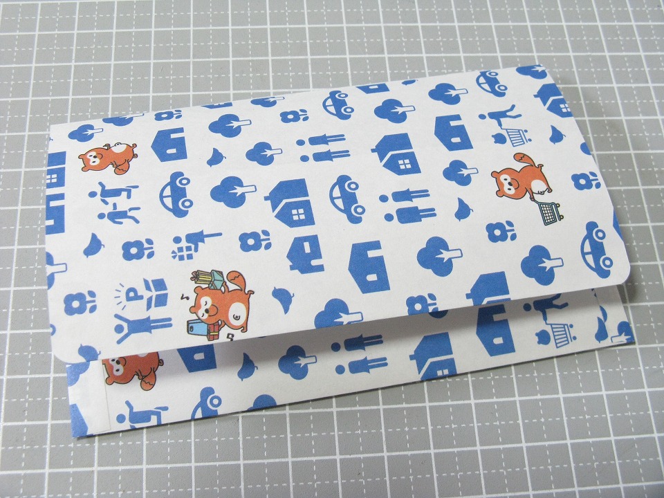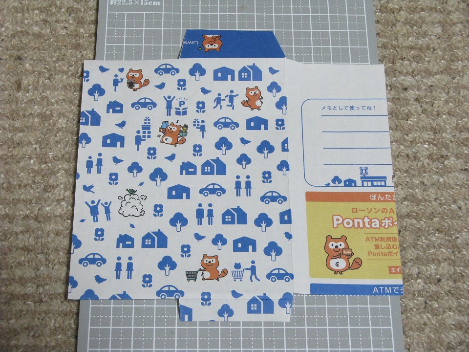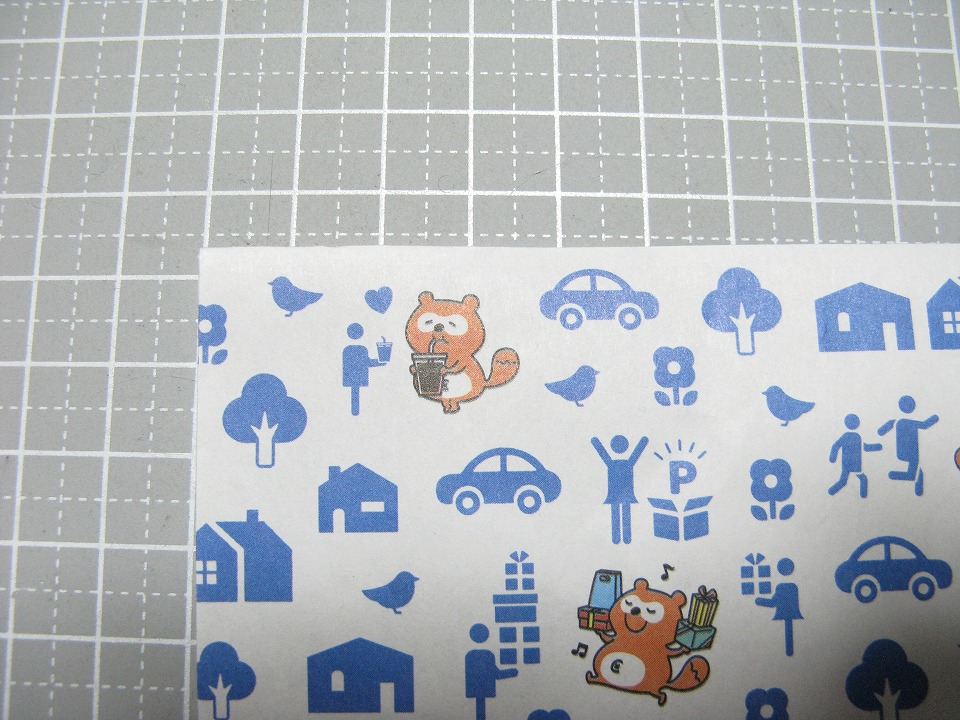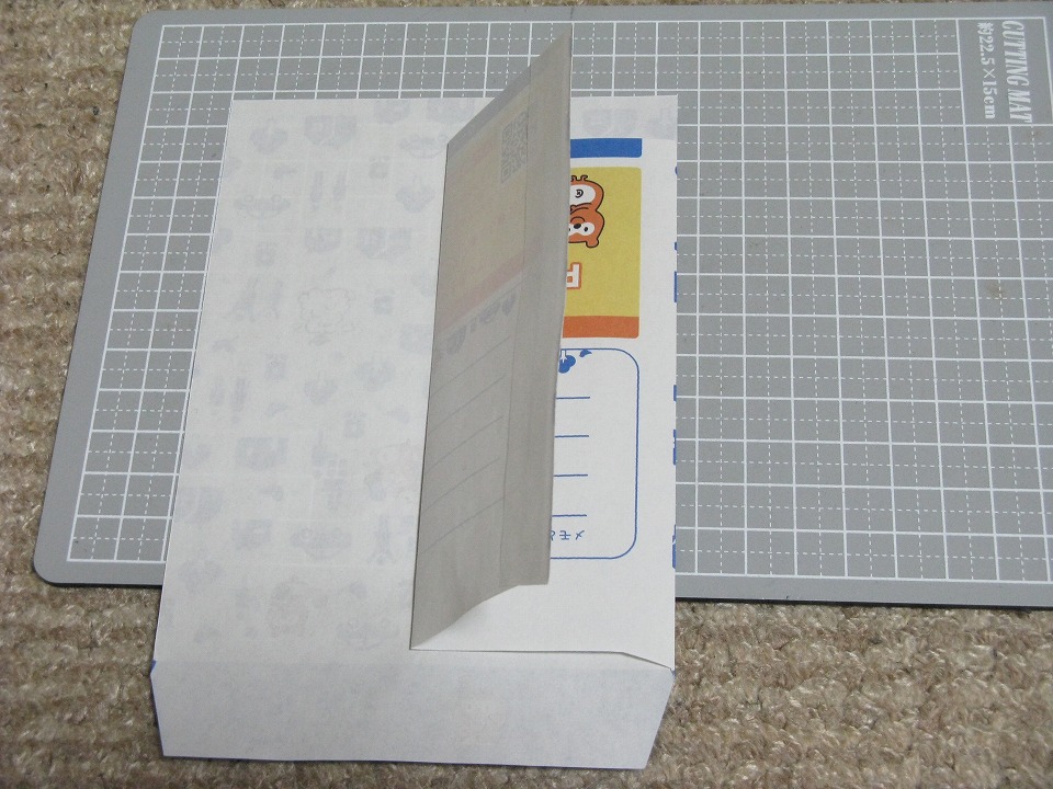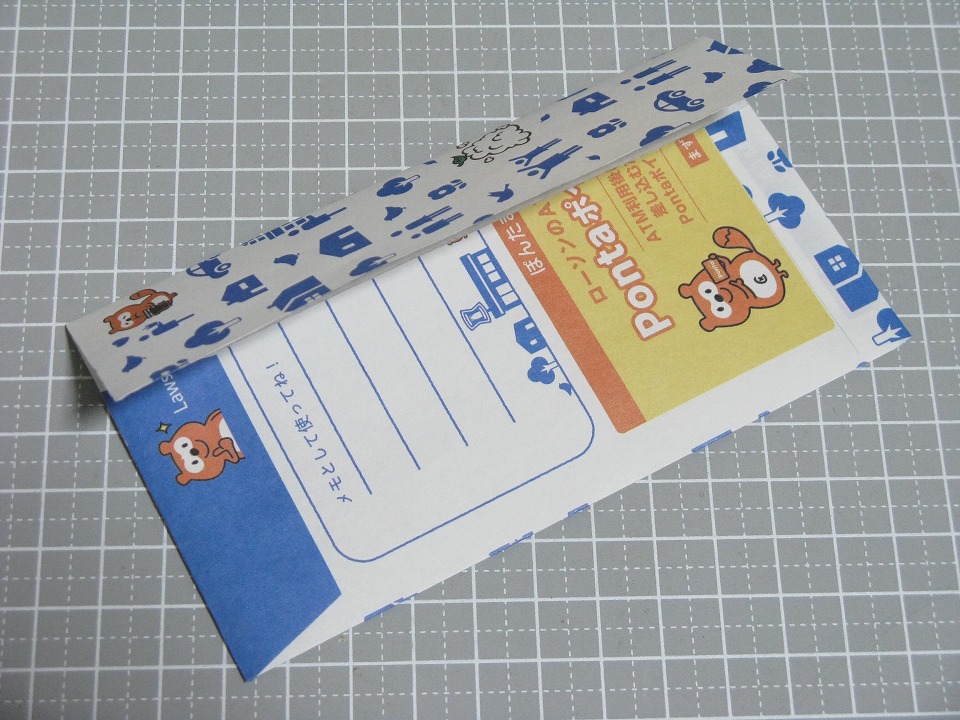 | 右側の封筒の、カートを押してるポン太くんの尻尾の先でタテに折る。 |