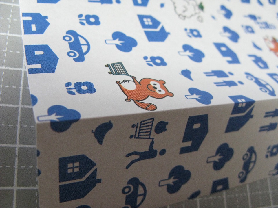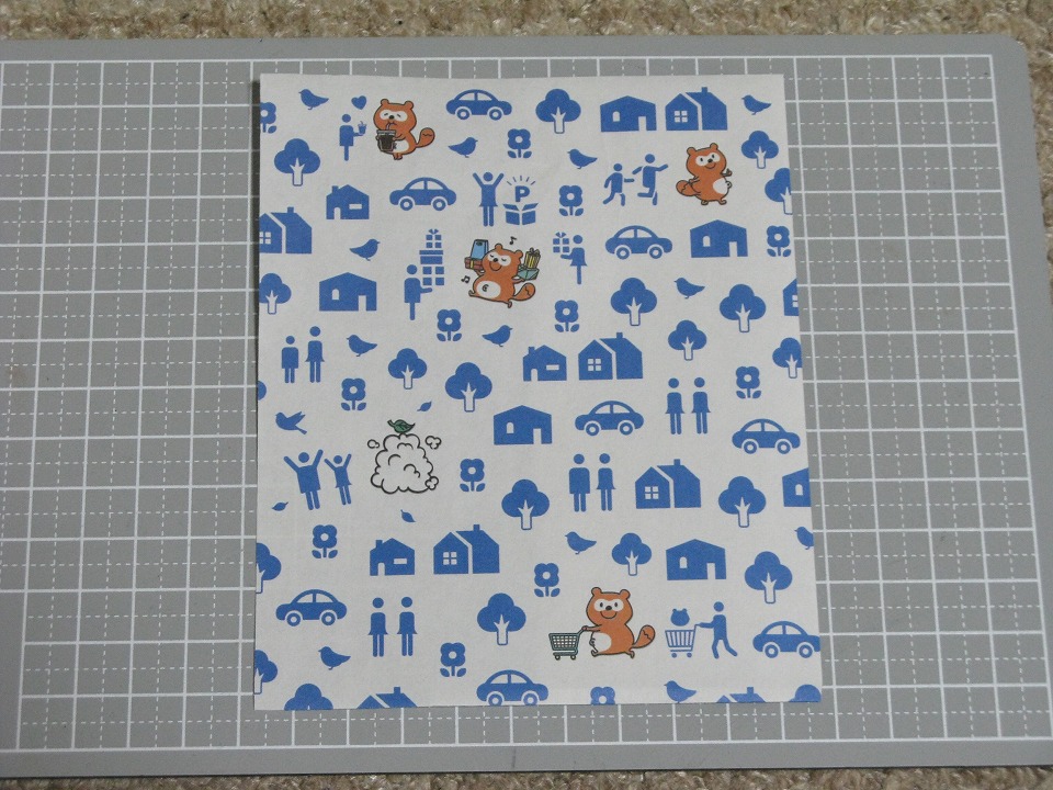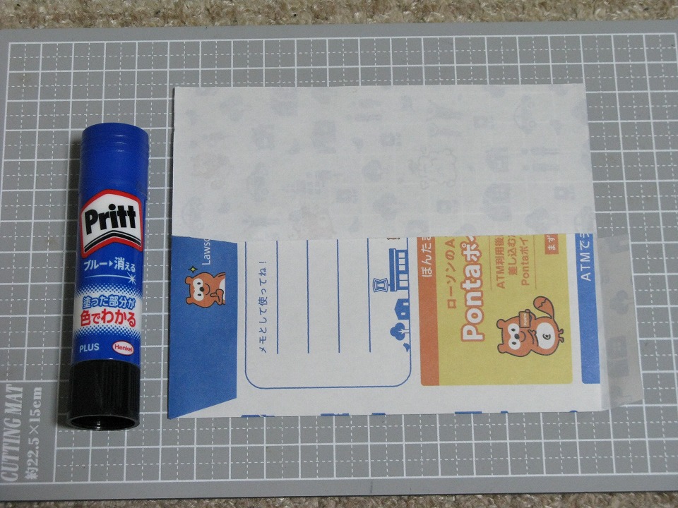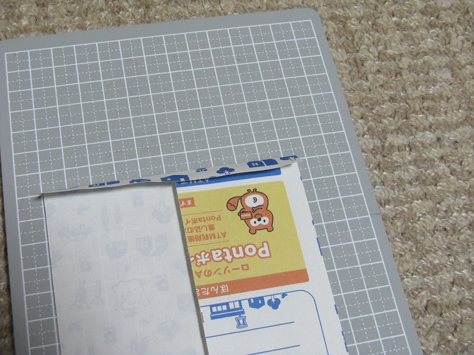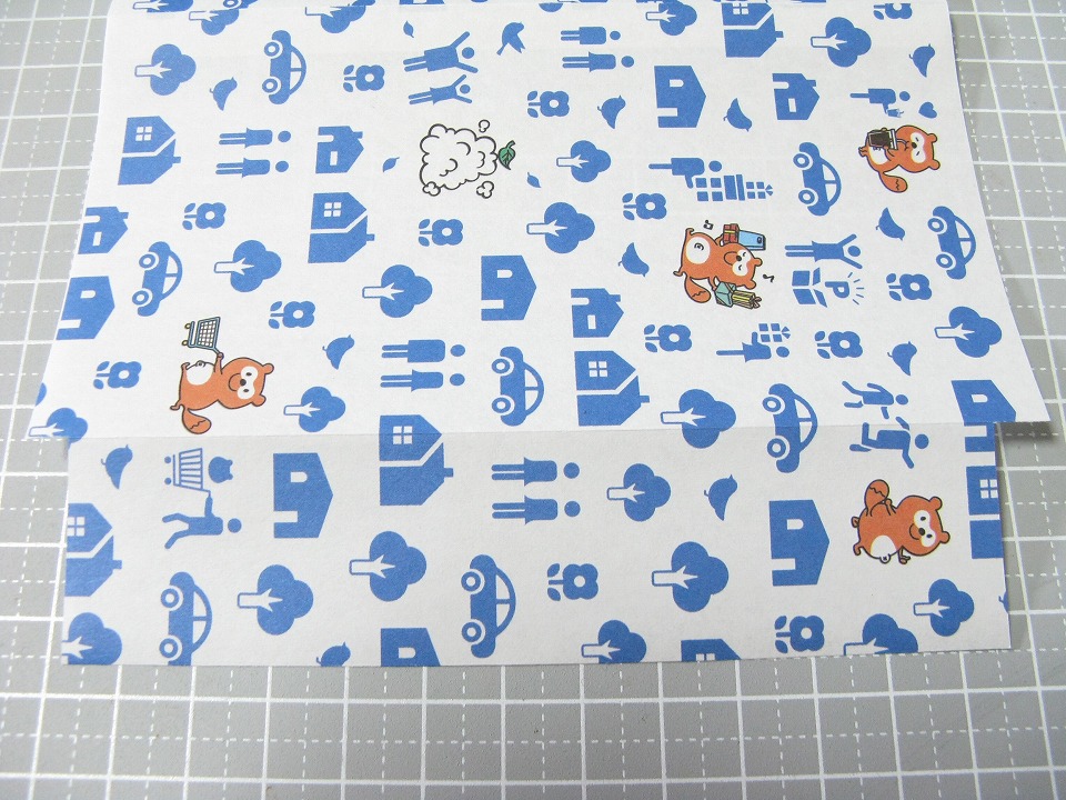 | 右側の封筒の、カートを押してるポン太くんの尻尾の先でタテに折る。 |