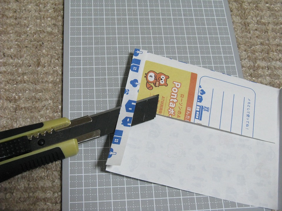 | 裏返して左辺を切り離す。 あ、俺はギッチョだからカッターの向きは、こう。 |