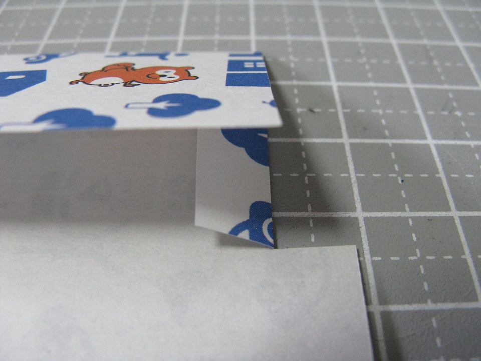 | フタになる部分を折る。 ドリンクを飲んでいる「ポン太くん」の尻尾の右端とした。 |