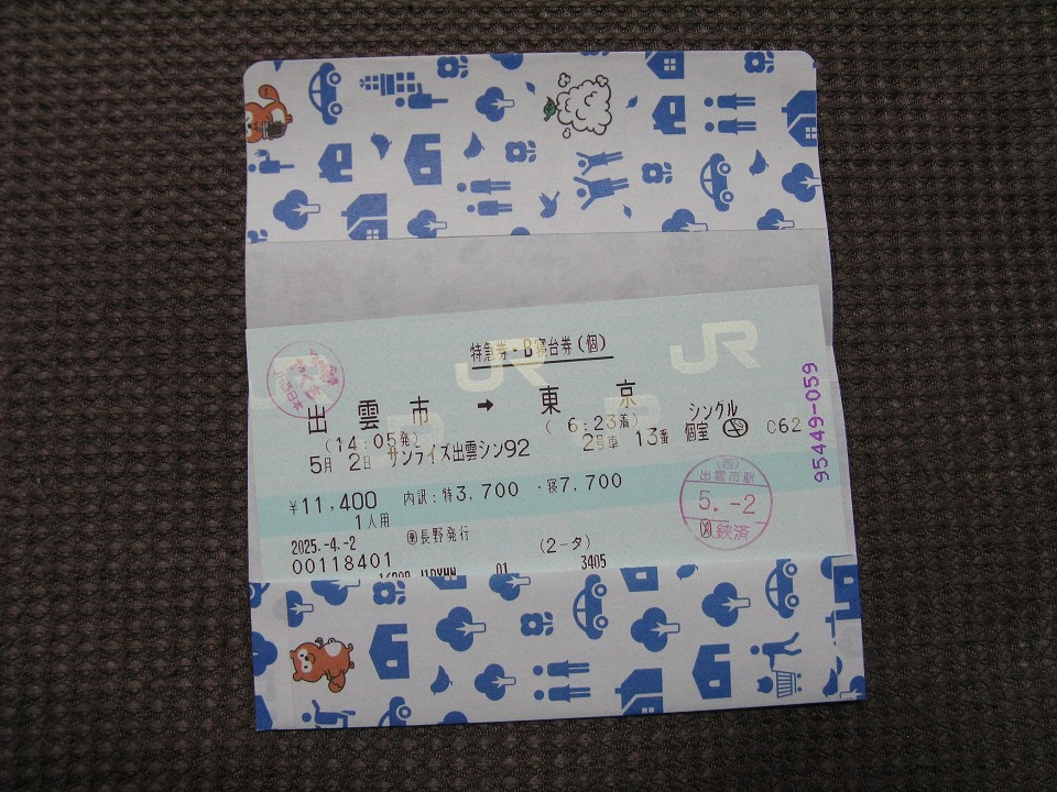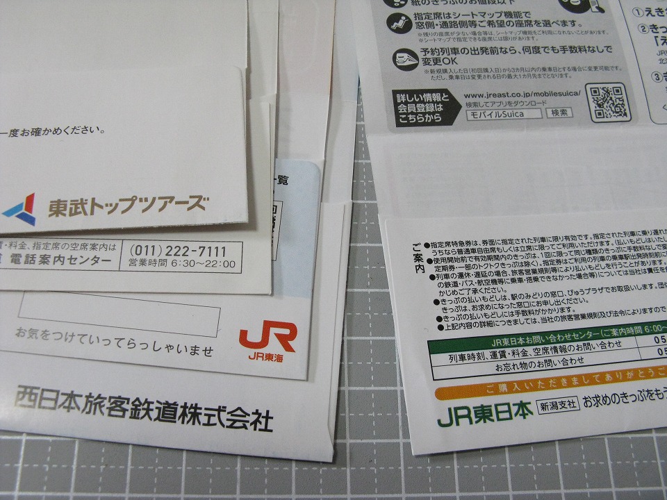 | 旅の記念のきっぷを入れて想い出にしよう。 ※この写真のチケット袋は、さらにあとで作ってみたもの。 フタの強度を増すために、フタの部分を長く取り、折り返して全面を糊付けした。 糊付けしたら乾くまで何かに挟むか重しをしておかないと、フニャフニャに「波打つ」よ(笑)。 女子友さま、これならいいだろ(連絡したが返信なし(苦笑)。)。 |