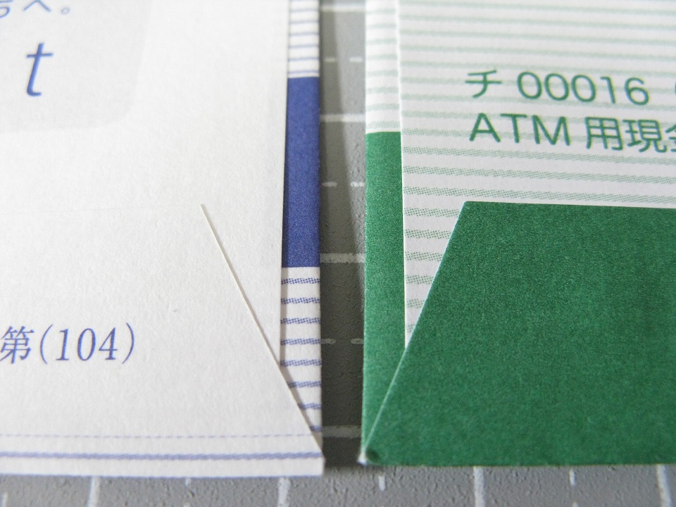 | 銀行界の封筒も同じ。右閉じ、左閉じの違いはあれど、ヨコのベロは中に入っている。 左はみずほ銀行の、右はゆうちょ銀行のもの。 |