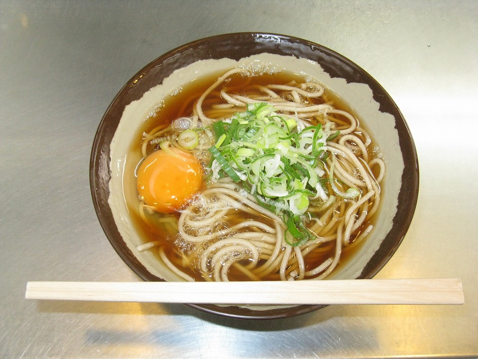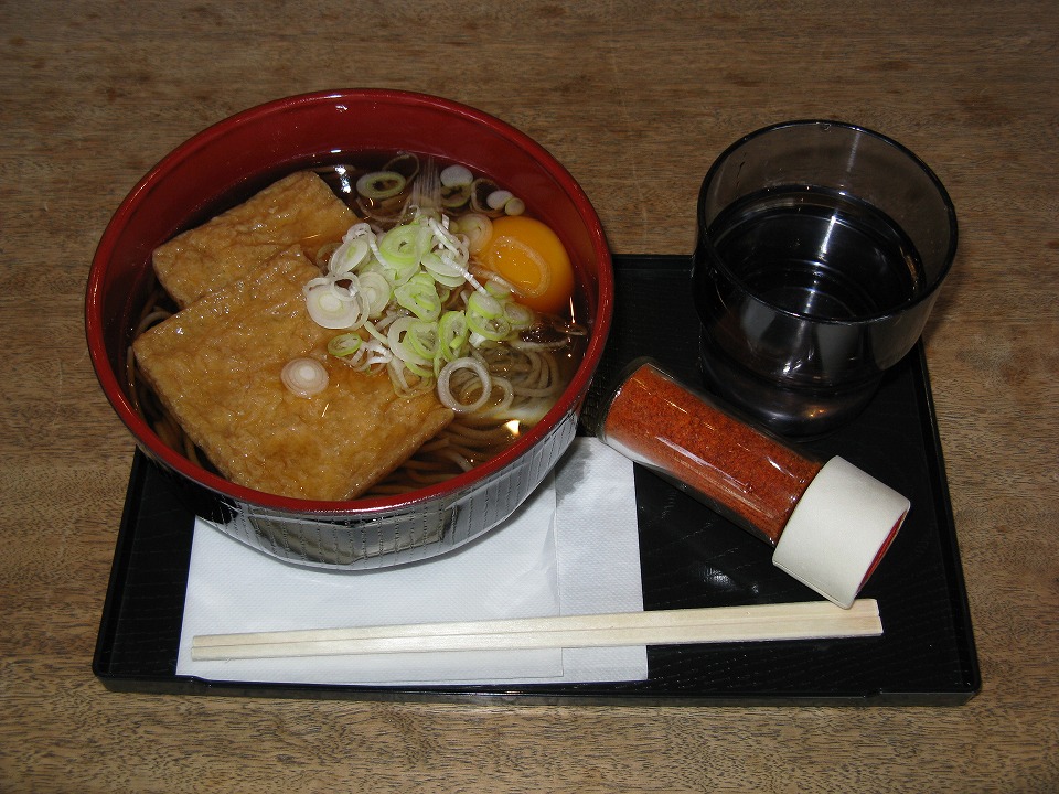 | きつねそば640円ナリと生玉子120円ナリ。 どっちもいい値段だなぁ。でも、駅そばが存在しているだけでありがたい。 店でも立ち喰いできるが、店の前のコンコースに立派なテーブルと椅子があり、そこで喰うこともできる。 その場合は、店員さんがわざわざテーブルまでそばを運んでくれるので恐縮する。 ちなみに、七味は倒した状態で持って来てくれるよ。 |
