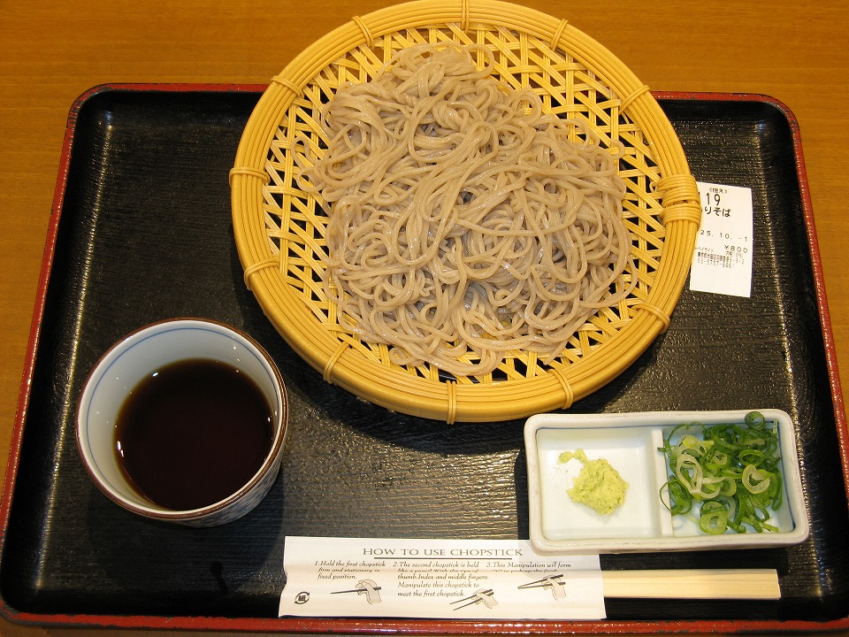 | もりそば800円ナリ。 今は善光寺周辺のそば屋でも1,000円近くする店がほとんどなので、空港内で800円という値段はむしろ安く思えるぐらいだ。 味は、麺もつゆも、まーこんなもんか、というレベル。 ど~でもい~けど、「ざる」はプラスチックだが、一体成形ではなくて、いっちょ前にプラ部品を編んでざるに仕上げてある。 この写真は、カラーバランスがちょっとうまくないです。 |