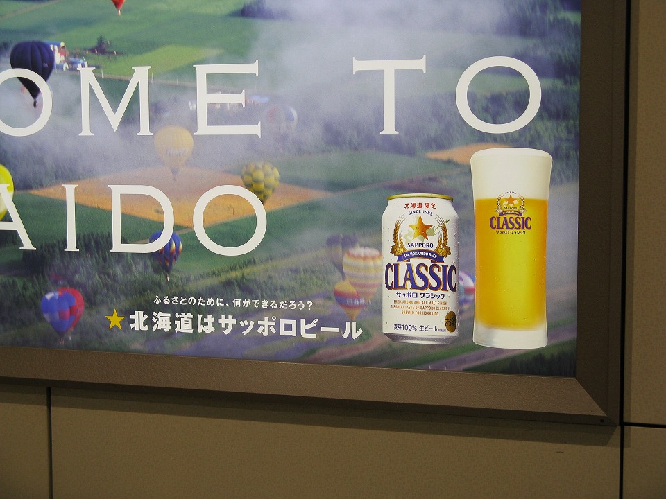 | 羽田から約1時間30分で、もう新千歳に着いた。 サッポロクラシックが出迎えてくれるのが、オリオンが出迎えてくれる沖縄と違うところだ。 石垣便の半分の時間で着いちゃう。 途中はずっと雲の上で、地上の景色は何も楽しめなかった。 岩手山でも見ようと、楽しみにA席をセレクトしたのに、残念。。。 |