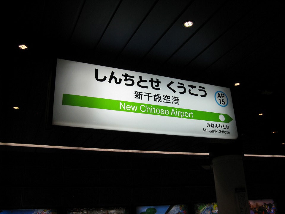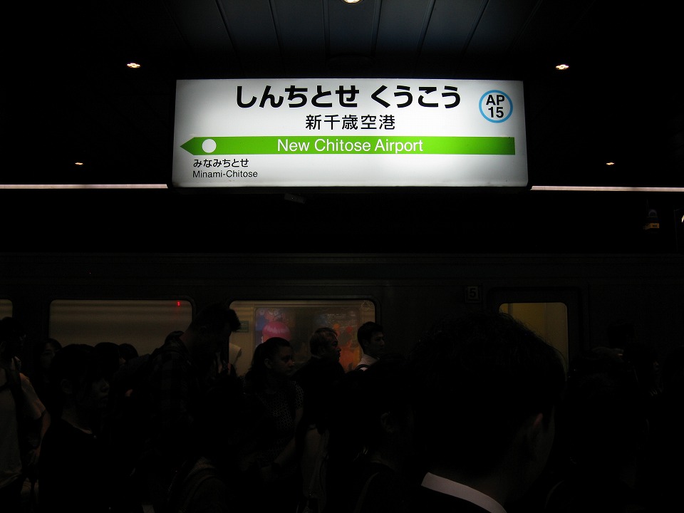 | 南千歳から僅か3分で新千歳空港に着いた。 えっっらい人だ・・・。 この写真は人の顔がハッキリしないように暗く撮影。ちょうど内照式の駅名表示板がきれい写った。 |