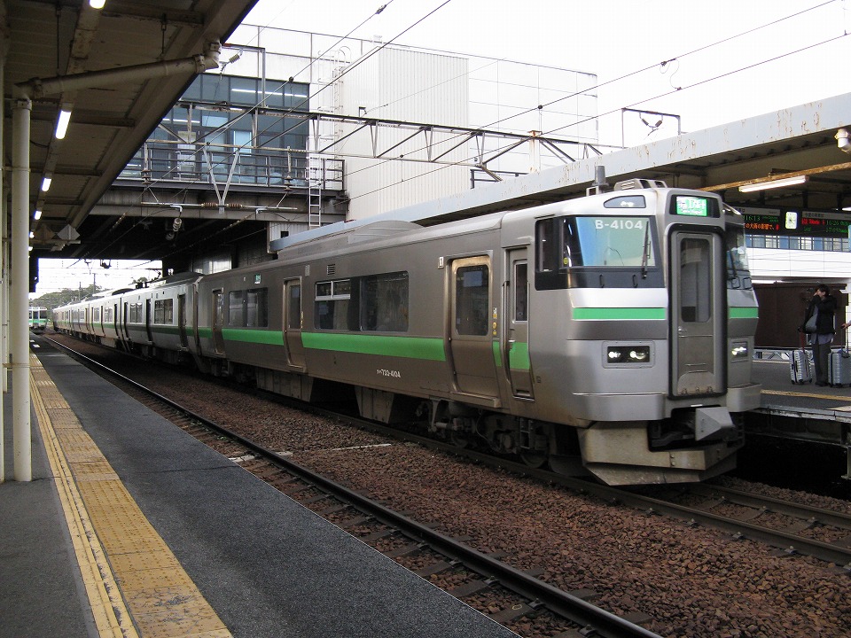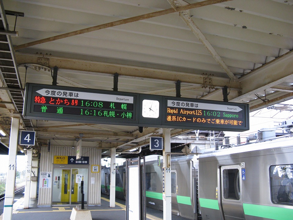 | 「とかち8号」が南千歳を発車する。 ホントはここから札幌までこの列車に乗るつもりで、新千歳空港で指定券を買おうと目論んでいたのだが、 指定券発売機もみどりの窓口も長蛇の列で買えなかったのよ。 落ち着いて考えてみれば、ここ南千歳で買えばよかったんだ。 もちろん、前もって長野駅で買っておいてもよかったんだけど、発行箇所が北海道の方がいいかな~、なんて余計なことを考えたのがアダになってしまった。 |
