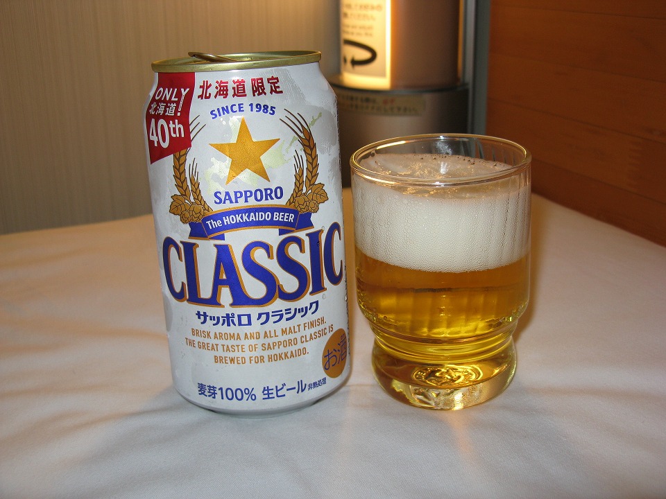 | 北海道に来たら、何はなくともクラシックでしょう。コクがあって旨くて大好きなビイルだ。 クラシックの後は焼酎に移行する。 |