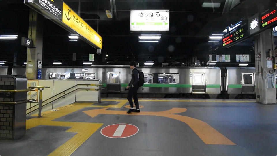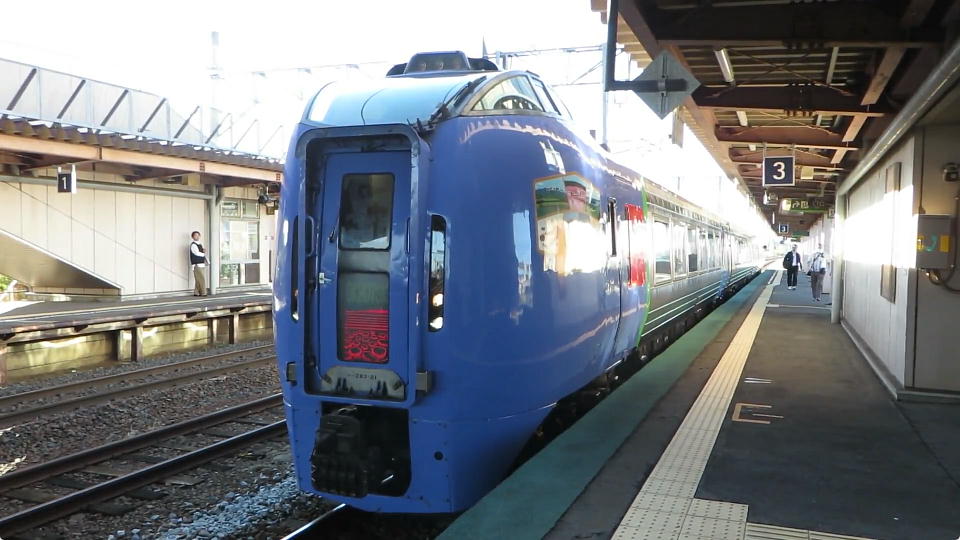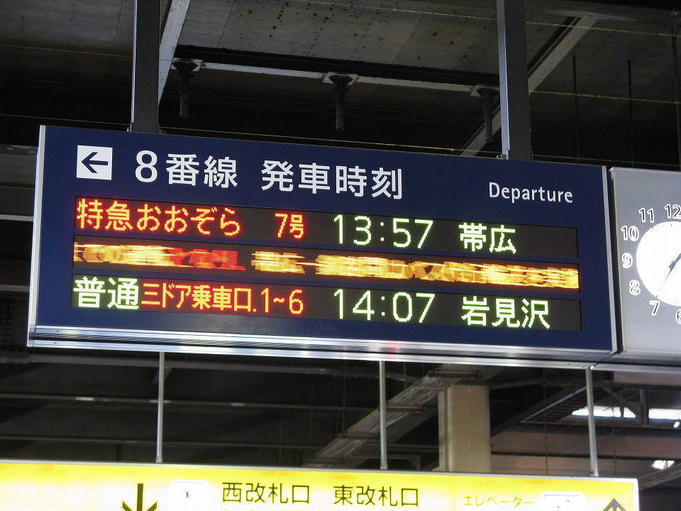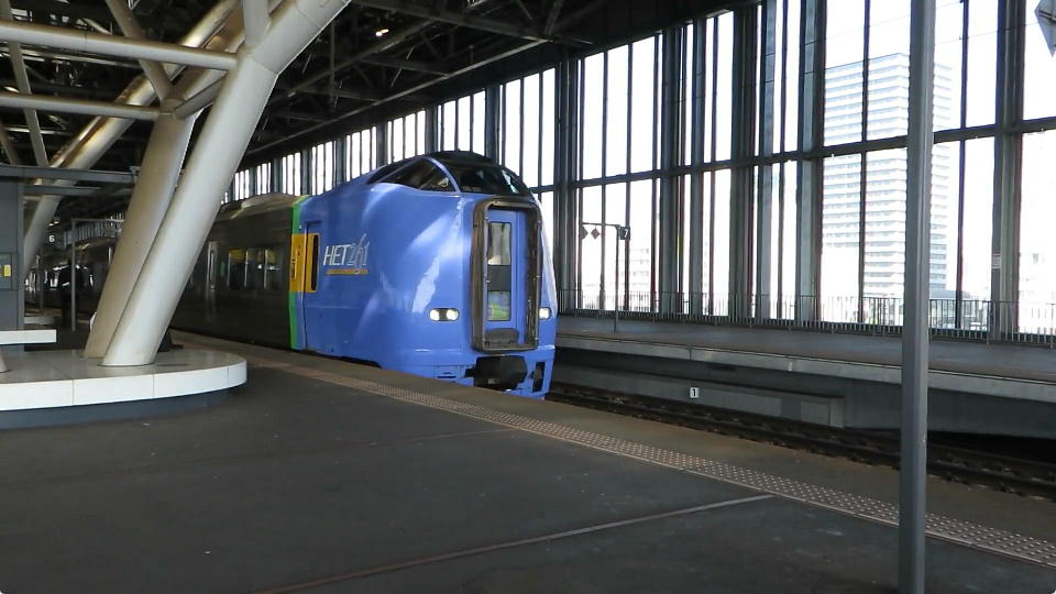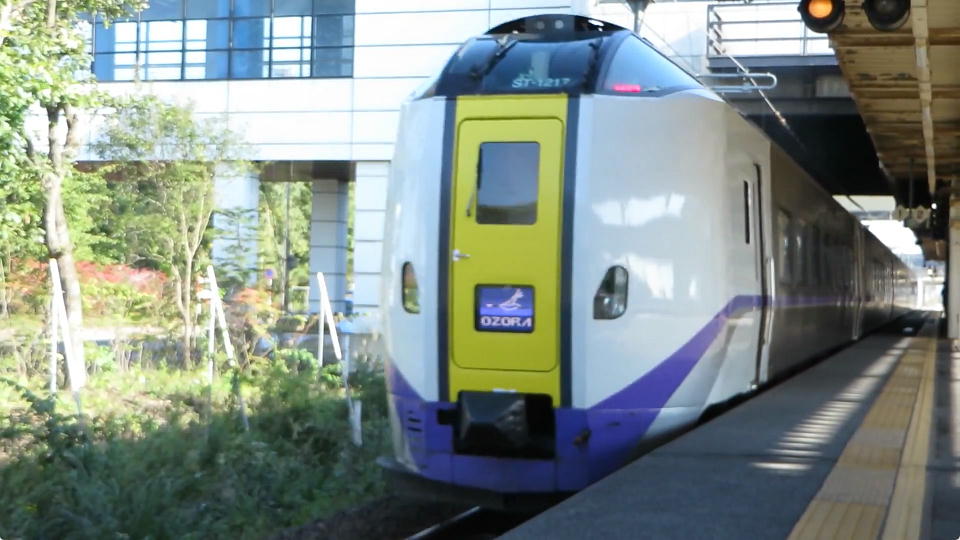 | 「おおぞら7号」の札幌発車時の、ちょっと長い約4分の動画はこちら。 「イランカラプテ」の挨拶は、なし。 自動の車内放送中に発車した。放送内で「この先揺れる」旨をアナウンスしているので元々発車前から流すことを想定しているみたいだった。 スピーカーがちょっと遠くて車内放送があまりよく収録されていない。 |