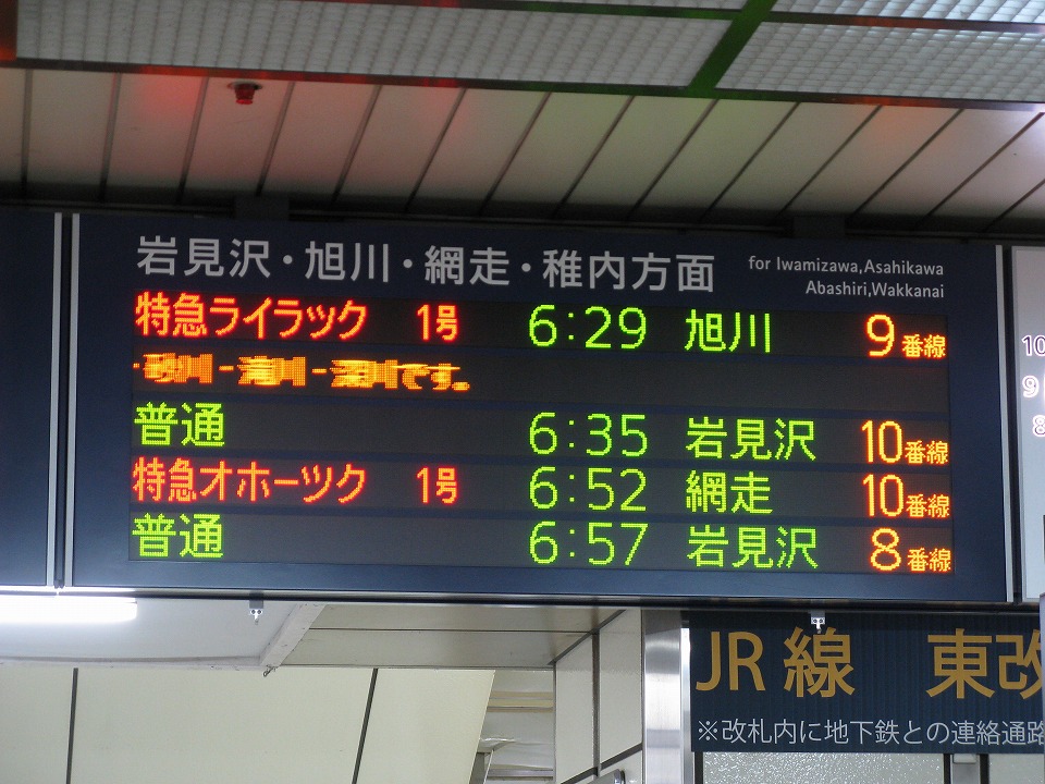 | おはよ~さんでした。 04:30にスッキリ起きて、今日の行程の確認をしていた。 ・シゴトは札幌駅周辺で14時から。 ・朝、「オホーツク1号」と「宗谷」に乗って旭川に行く。 ・旭川電気軌道の「MR430」とご対面 ・旭川からはどんなに遅くとも12:00発の「ライラック20号」で札幌に帰ってこなければならない。 ネットで確認した交通情報では、JRや高速道路は特に支障ないようだ。 でも、何かあったらすぐに札幌に戻れるようにすることを常に意識しつつ、では出発~! |